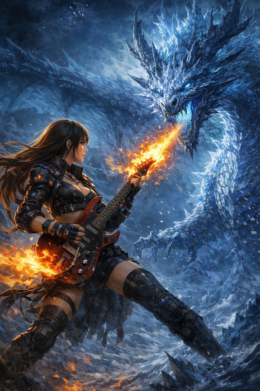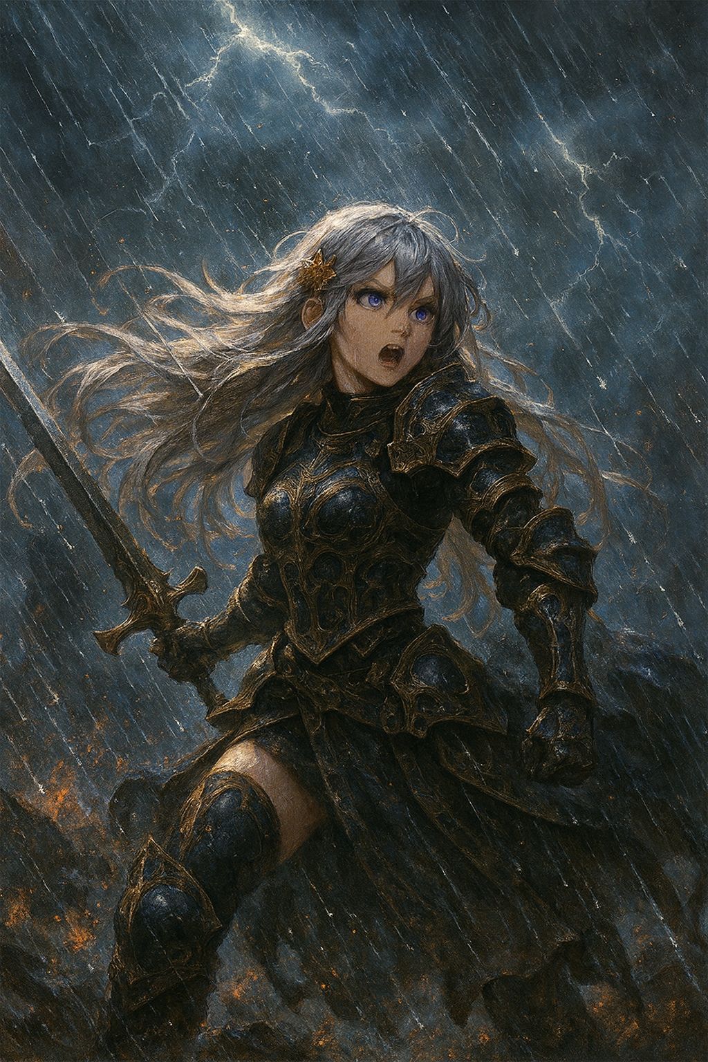 female vocal, German Power Metal, very fast, double-bass drumming, twin lead guitar solo, epic, dramatic, Gamma Ray style, key change