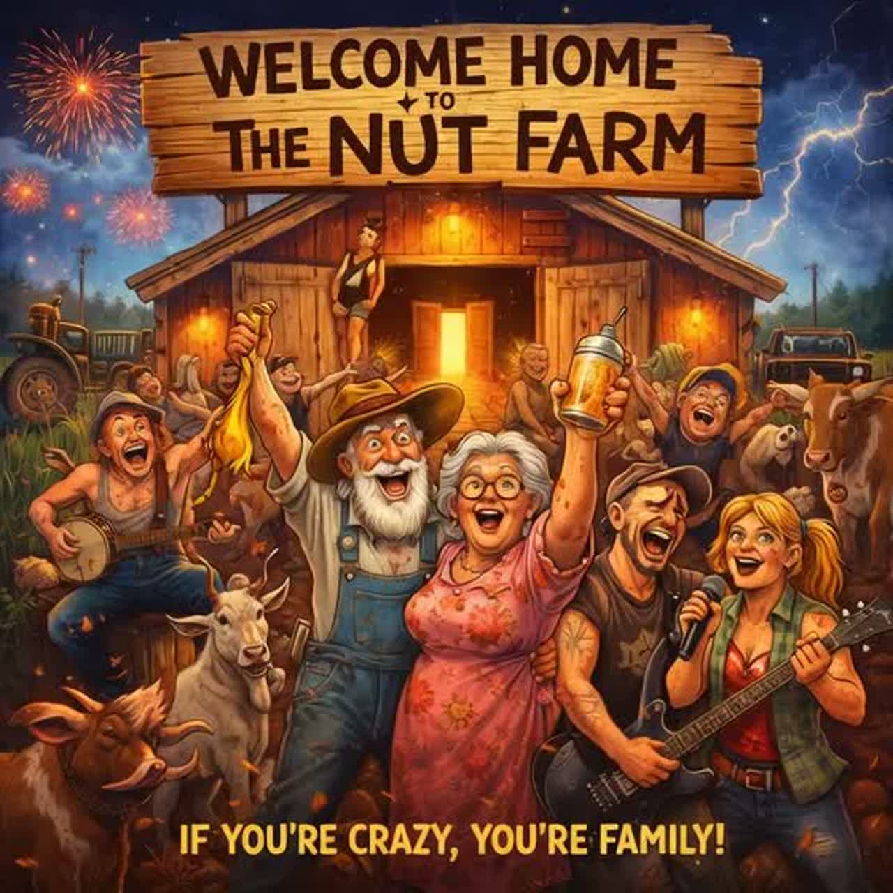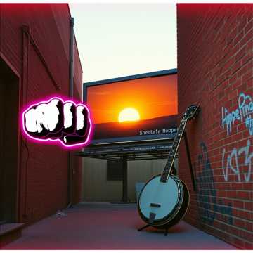 rap, Hillbilly rap-punk-metal mash: clustered percussion and clattering rims, glitched fuzz guitar stabs against twangy long-note banjo, plucked and strummed upright bass, Call-and-response male/female vocals with shouted gang bits in the hook, verses half-rapped with a loose drunken swing, Choruses explode with chant energy and doubled screams, tempo pushing like a rowdy barn show on the edge of falling apart, punk, classic, metal