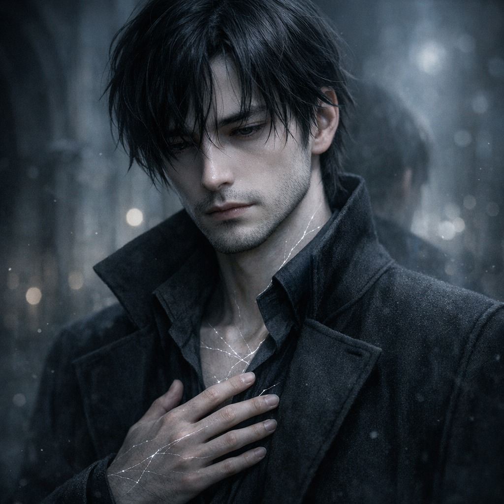 A dark fusion of classical music, cyberwave, electro-gothic, and cinematic dark pop in B minor at 75 BPM, Wide dark synth pads and a deep, steady synth bass form the foundation, while piano carries the intimate melodic core and strings provide slow swells of drama and emotional weight, There are no drums; the movement comes from pulse, harmony, silence, and breath, The male vocal should feel low, close, restrained, and haunted, almost confessional in the verses and quietly breaking open in the choruses, Only in the instrumental solo do timpani enter, adding a sudden surge of tragic cinematic force before the final emotional swell, The overall sound should feel spacious, soul-heavy, melancholic, and beautiful, with grief suspended in still air