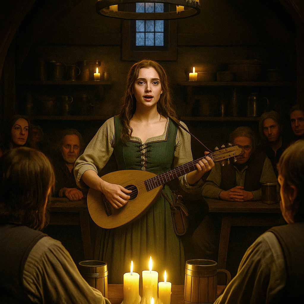 Exceptional voice female vocalist, A lively and rustic bardcore tavern anthem with a celebratory and slightly raucous energy, The core of the sound should be driven by a prominent deftly plucked lute or gittern should carrying the main memorable melody, Rhythmic drive comes from a boisterous frame drum and a rattling tambourine, For melodic flourishes and solos a sprightly fiddle or rebec is essential for the main tune, A shawm or a simple wooden flute can provide a bright reedy counter-melody while a subtle droning hurdy-gurdy in the background adds a rich textured layer characteristic of the era, The overall production should feel acoustic and spacious as if recorded in a bustling tavern, Male vocals should be hearty and full-throated with a clear storytelling quality with a slight, charming roughness, A simple catchy chorus that invites patrons to sing along is key