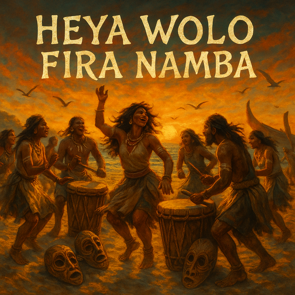 The song begins with low, resonant group chanting over slow tribal drums and a distant horn, evoking the open sea, Verses use a steady rowing rhythm with call-and-response vocals, supported by deep percussion, Choruses are louder, with layered voices and uplifting energy, Transitions feature drum fills, horn calls, and short breaks with only vocals, Mid-song, tempo increases with bright flutes as the island nears, The bridge is celebratory, with dancing drum patterns and melodic flutes, The final chorus is triumphant, followed by a decrescendo into sea ambience for the outro, Song Description: tribal folk, sea chant, storytelling, epic, rhythmic, folk