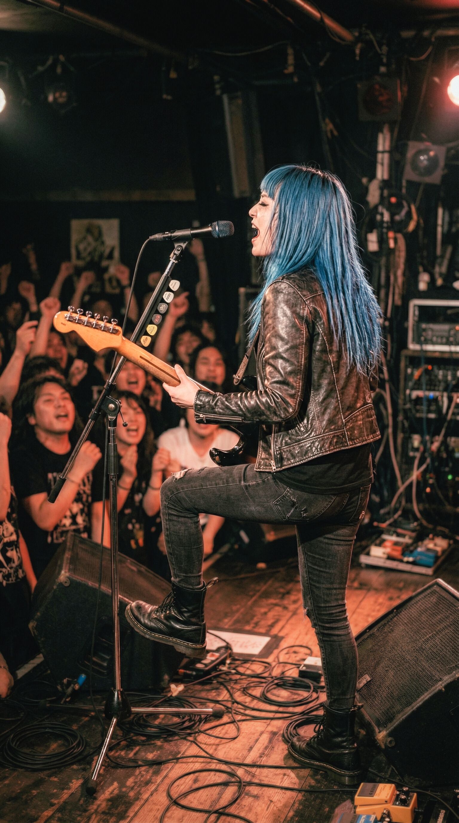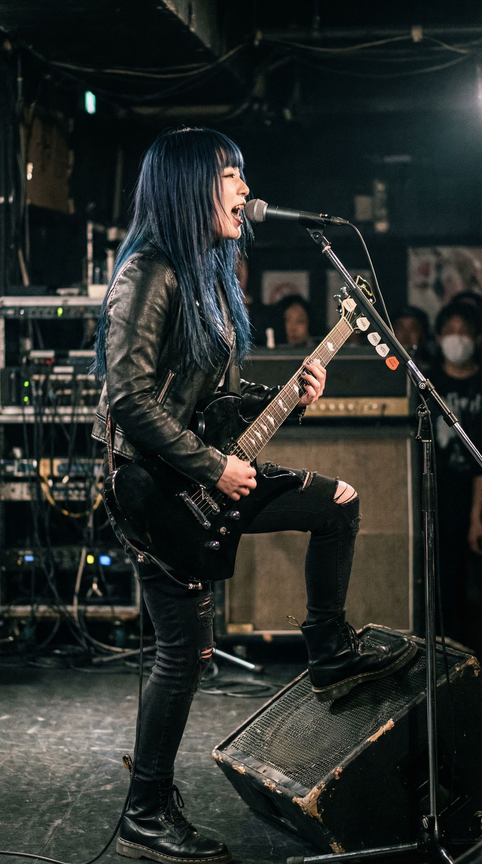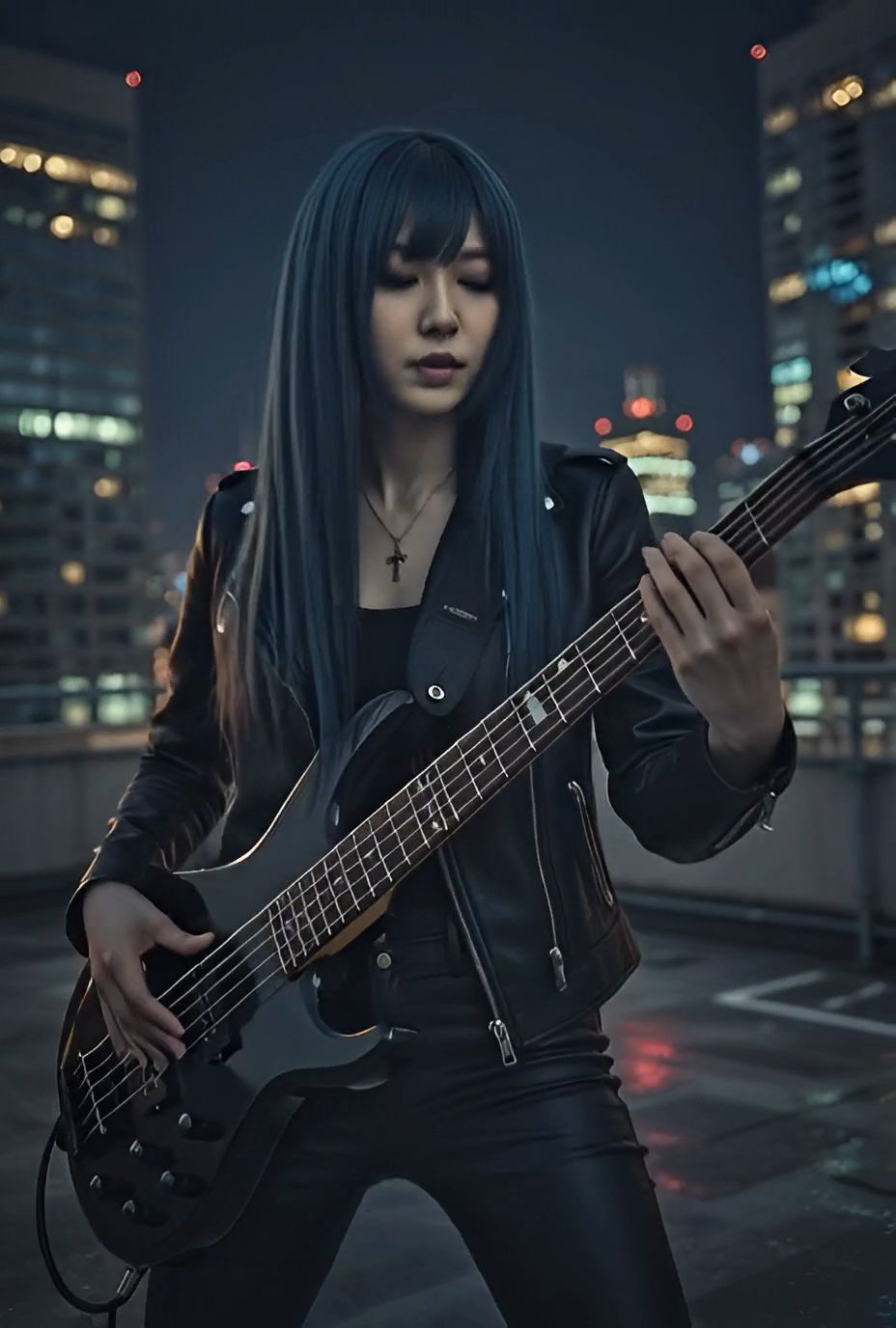Japanese glam alternative rock, drop D tuning, explosive distorted guitars with digital edge, groovy funky rhythm section, tight energetic drumming, Cool emotional female vocals, powerful bass, tight bass, warm, analog, balanced mix, crisp production, well-balanced instrumentals, Loud, High volume, ‑mechanical, ‑8bit, ‑Noise, ‑VOCALOID, ‑harsh, ‑treble, ‑bright
