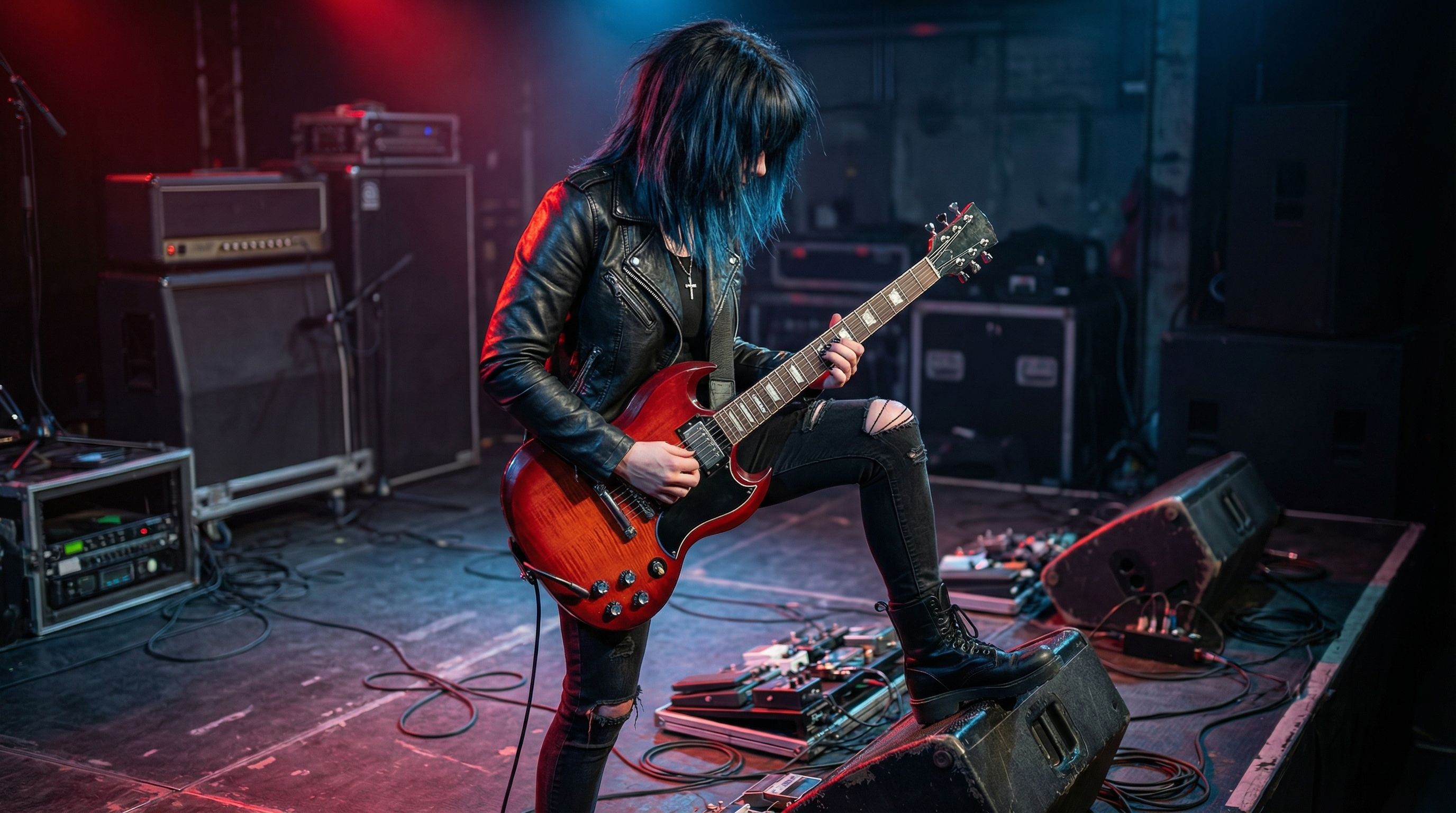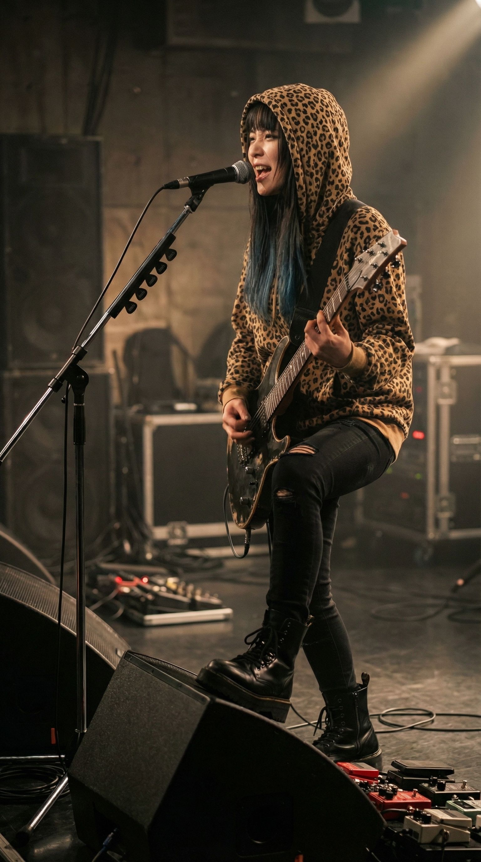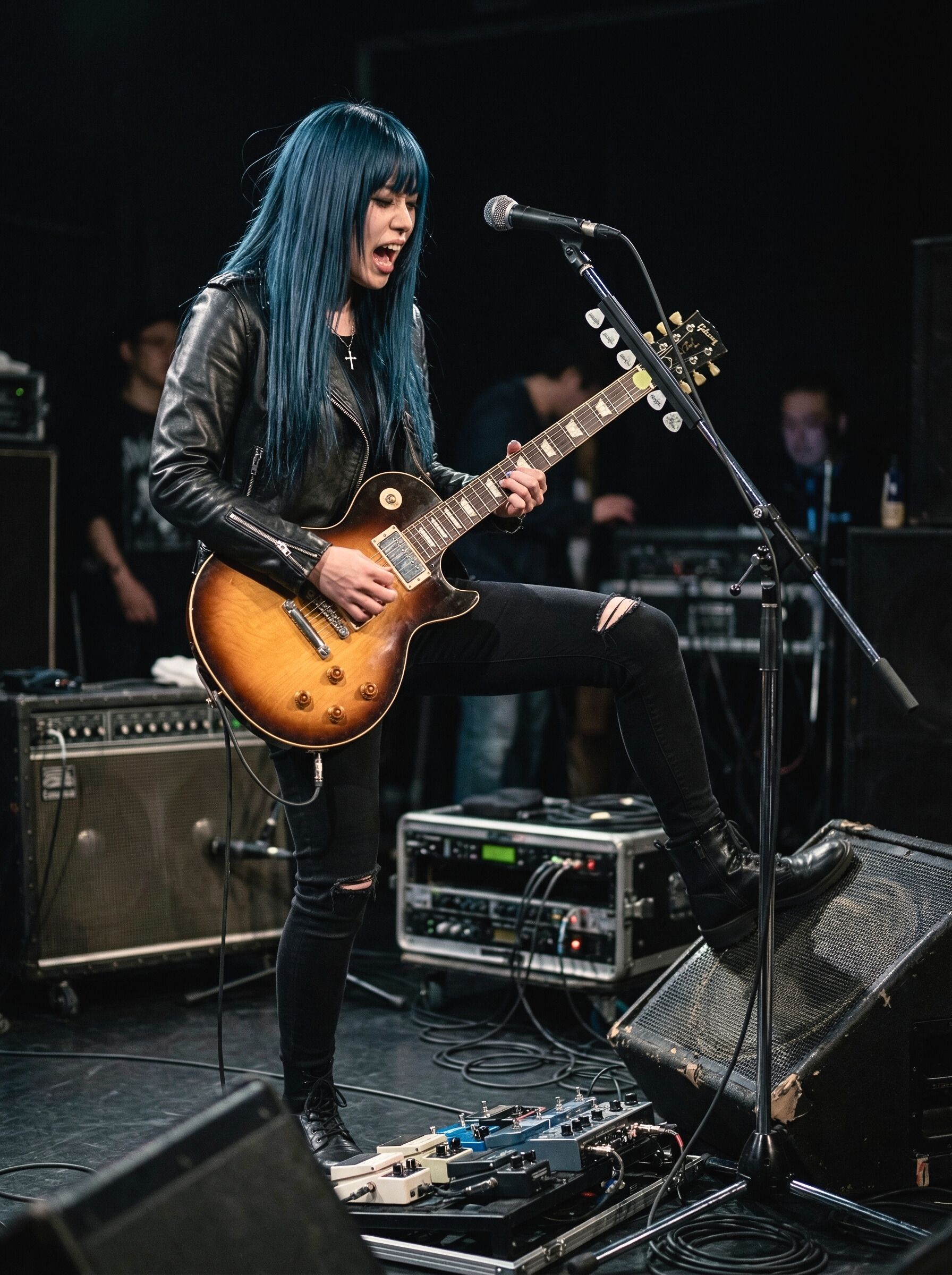 Japanese glam alternative rock, drop D tuning, explosive distorted guitars with digital edge, groovy funky rhythm section, tight energetic drumming, Cool emotional female vocals, powerful bass, tight bass, warm, analog, balanced mix, crisp production, well-balanced instrumentals, Loud, High volume, ‑mechanical, ‑8bit, ‑Noise, ‑VOCALOID, ‑harsh, ‑treble, ‑bright