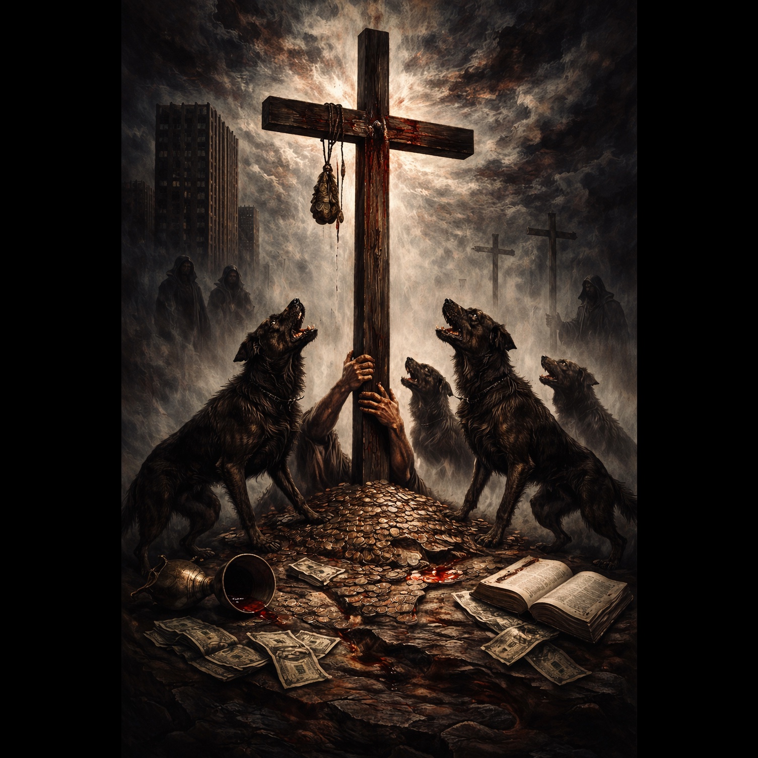 Sparse, haunting acoustic ballad, Mid tempo, minor key, heavy sense of age, regret, and moral reckoning, Brief two-measure instrumental opening with dry, fingerpicked acoustic guitar and faint room ambience, Verses remain stripped down—acoustic guitar, subtle piano or low organ pad barely underneath, occasional brushed percussion or soft pulse like a distant heartbeat, Choruses introduce restrained multiple vocal harmonies, ghostlike and low in the mix, adding weight rather than fullness, Emotional arc should feel confessional, solemn, and unsparing, Bridge grows slightly in intensity with swelling low strings or bowed bass, distant electric guitar feedback, and atmospheric textures suggesting decay and memory, Dynamics remain controlled, Final section expands to full band: acoustic guitar, piano, low strings, minimal drums, and harmonies supporting an emotionally cracked lead vocal, Overall mood: stark, penitential, reflective, Vocals and instruments volumes are set equally
