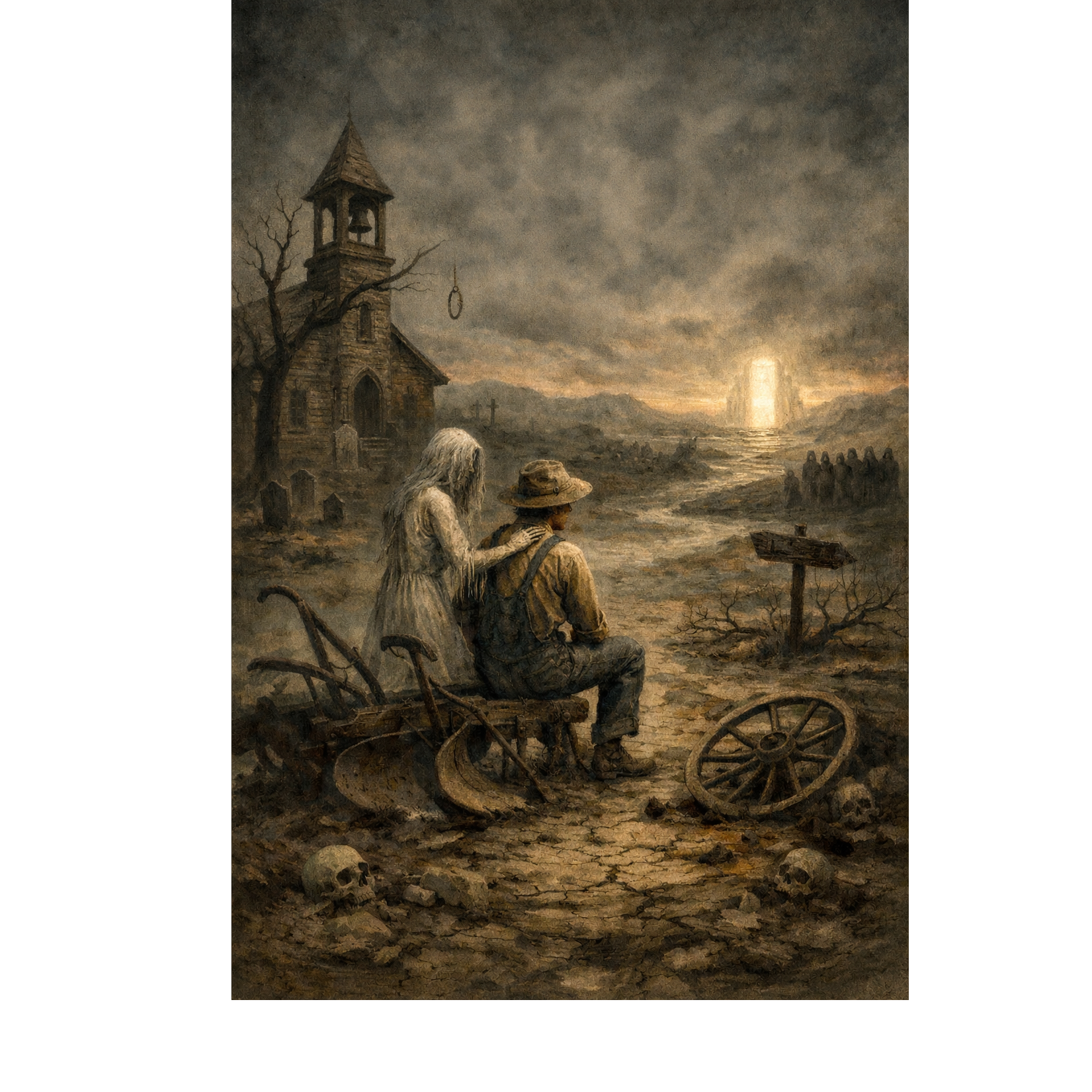 A tense, atmospheric folk-rock piece opens with a pulsing fingerpicked acoustic guitar, soft upright bass and sparse brushed drums, evoking both intimacy and unease, Breathy, reflective, depressing male vocals, Passionate harmony in choruses, Subtle organ swells and mournful strings rise in the chorus, deepening the tapestry, while a bridge features low drone and minimalist percussion, adding somber weight before settling into a haunting, resigned resolution