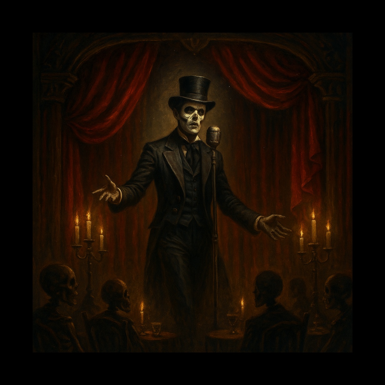 Begins with a male voice incantations from shadows over sparse, unsettling piano chords, Verses swell as his eerie and theatrical voice weaves sinister melodies alongside mournful accordions, dark strings, and a galloping cabaret pulse, Choruses explode with grand, macabre intensity as layered masculine chants blend haunting piano flourishes with extravagant orchestral swells, A melancholic violin interlude, accompanied by spectral male whispers, deepens the gothic narrative, The breakdown pulses through a driving, sinister carnival melody punctuated by fragmented murmurs, The finale unites all elements—bold orchestration, intense rhythms, and commanding theatrical vocals—in a climactic, male-led crescendo of chilling grandeur