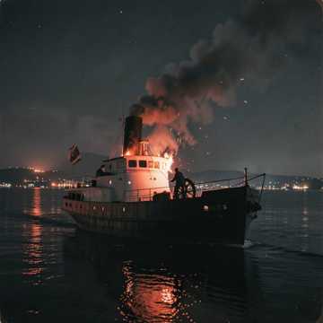 Ragga-Jungle, 170 BPM, Authentic Jamaican Patois vocals, gritty male dancehall deejay style, rapid-fire double-time verses, heavy Amen breaks, rolling sub-bass, atmospheric fire crackling sound effects, deep foghorn leitmotif, emergency sirens, heroic anthemic chorus, cinematic intensity