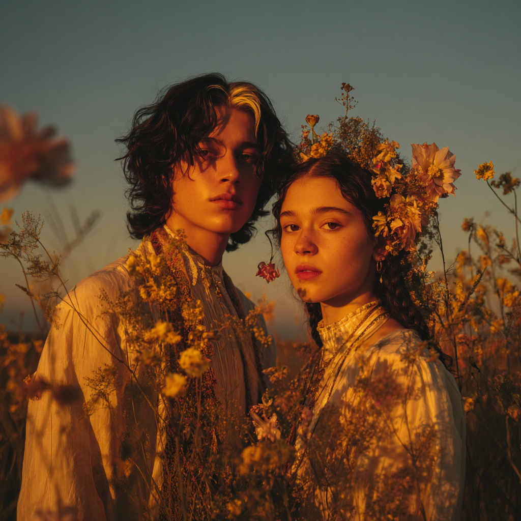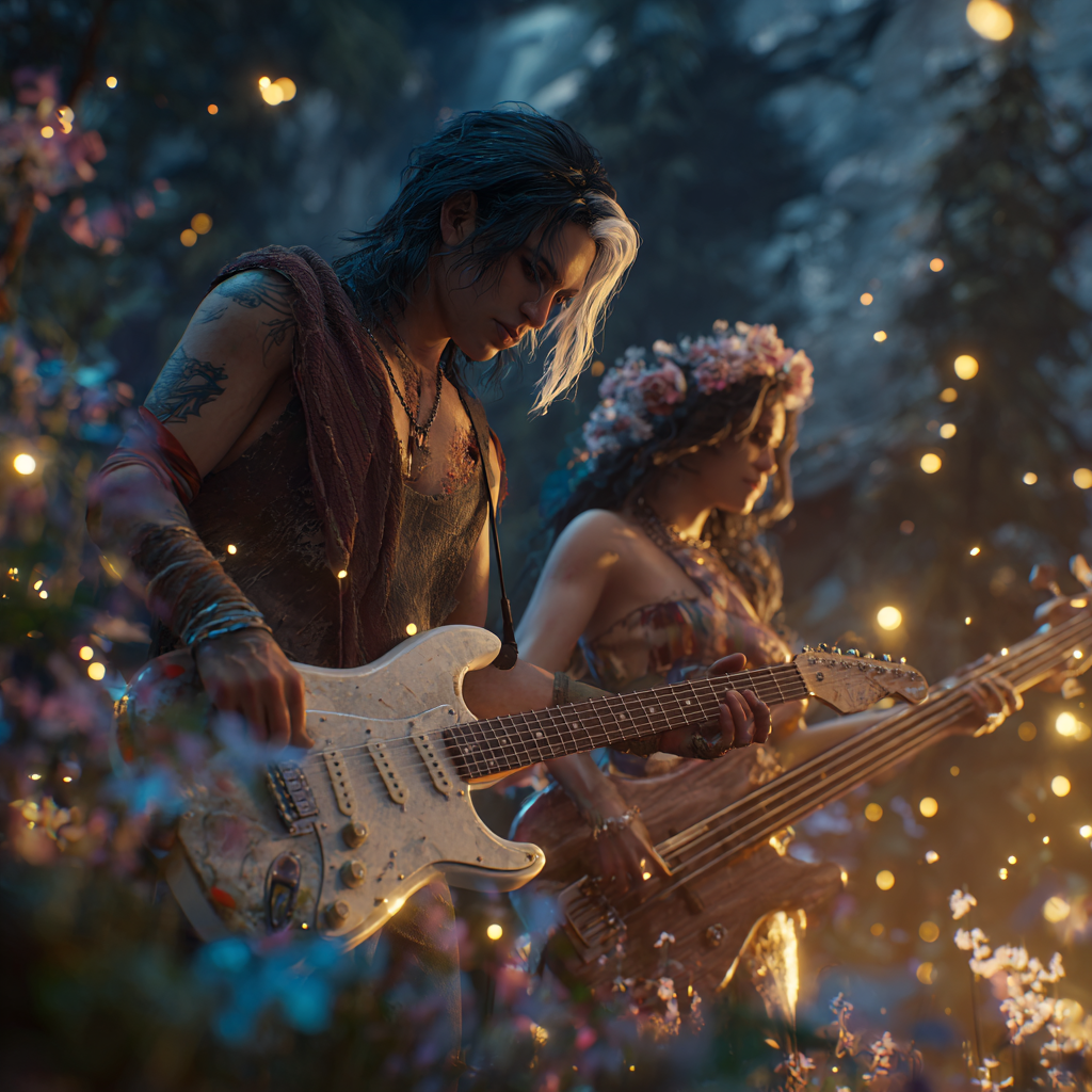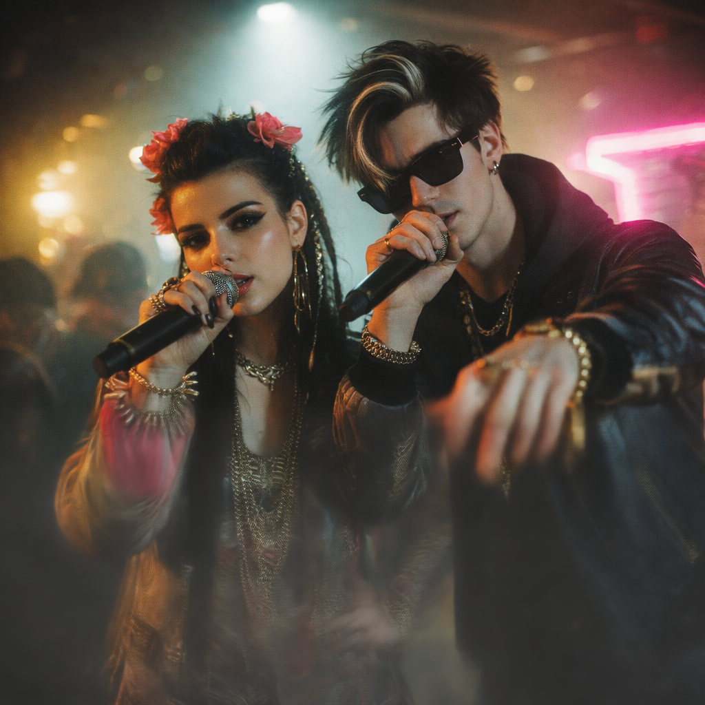 High-energy modern power pop duet with bright, driving electric guitars and melodic hooks, Upbeat 4/4 tempo around 155–165 BPM, Crunchy rhythm guitars in verses, wide open shimmering chords in chorus, Punchy live drums with tight snare and energetic fills, Bouncy melodic bassline supporting the groove, Romeo lead vocal confident, warm grit, slightly edgy tone, Chorus lead vocal clear, expressive, strong melodic presence, Verses alternate between Romeo and Chorus, Big stacked harmonies in the chorus with both voices blended tightly, Call-and-response moments between leads, Explosive, singalong chorus, Clean, radio-ready production, Bright, celebratory, intelligent, communal energy, Mood: confident, melodic, uplifting, heart-on-sleeve