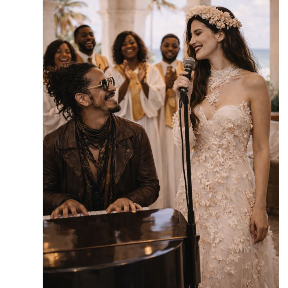 High-energy power pop duet at 148–152 BPM with playful new wave bounce, Punchy surf-style electric guitar riffs with slight chorus effect, driving melodic bassline, tight snare with crisp handclaps on 2 and 4, Upbeat, danceable groove with quirky synth stabs and bright rhythmic accents, Male and female vocal duet with call-and-response verses, stacked harmonies in chorus, Slight spoken-word intro energy, fun but confident delivery, Gang vocal shouts in final chorus, Clean production, no heavy distortion, glossy but not overproduced, Mood: joyful, electric, irreverent but sincere, Feels like neon church revival meets art-pop dance floor, Big hook repetition, chantable chorus, explosive final section with layered vocals and high-energy finish, Influence: upbeat new wave energy in the spirit of The B-52's, but modern power-pop polish