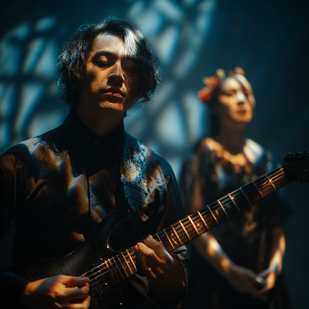 Mid-tempo progressive rock with moody, deliberate electric guitar picking (Fripp-inspired), repeating melodic motifs, subtle dissonance, and interlocking guitar lines, Controlled complexity—no shredding, no chaos, Steady odd-time or off-kilter groove, hypnotic feel, dark but spacious tone, Melodic bass moving against the guitar, restrained drums with tension and release, Atmosphere comes from precision and pattern, not speed or volume