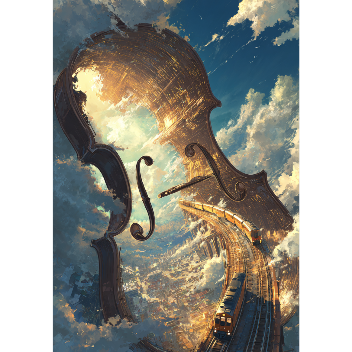 [guitar riffs and counterlines echoing rail vibrations and flickering city lights]