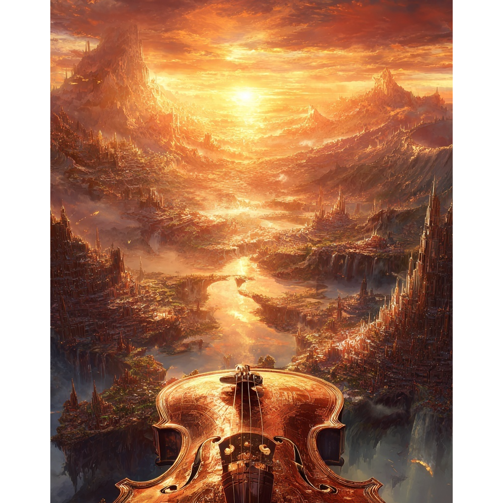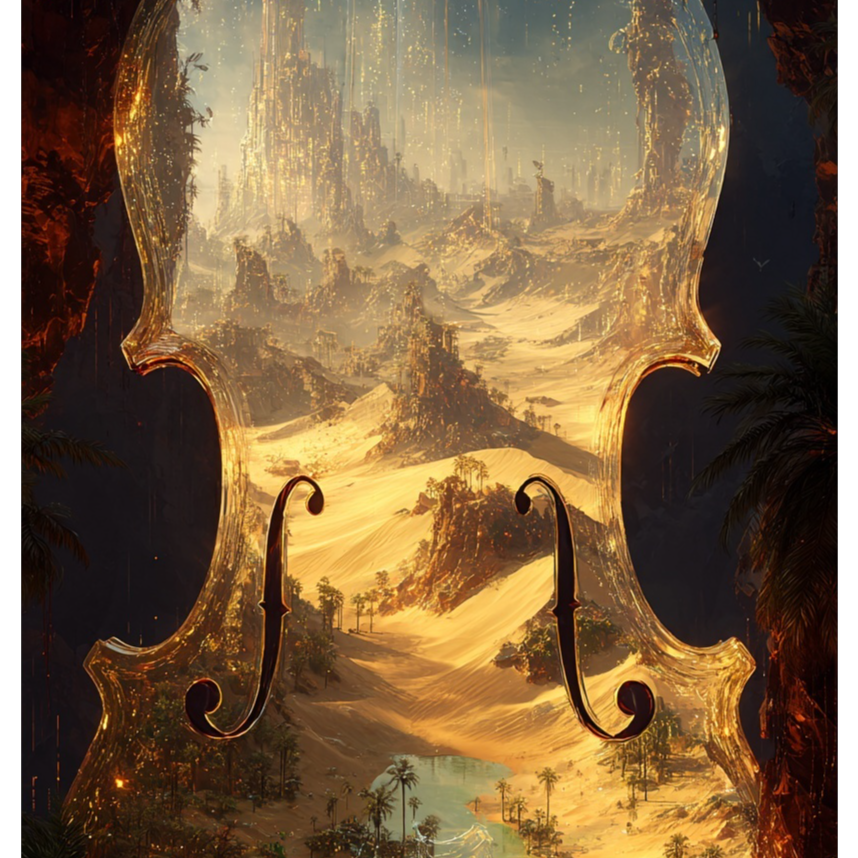 [expressive violin lead with shimmering trills, rapid scale runs like drifting sand, and soaring sustained notes evoking burning horizon, grounded by deep bass resonance, ]