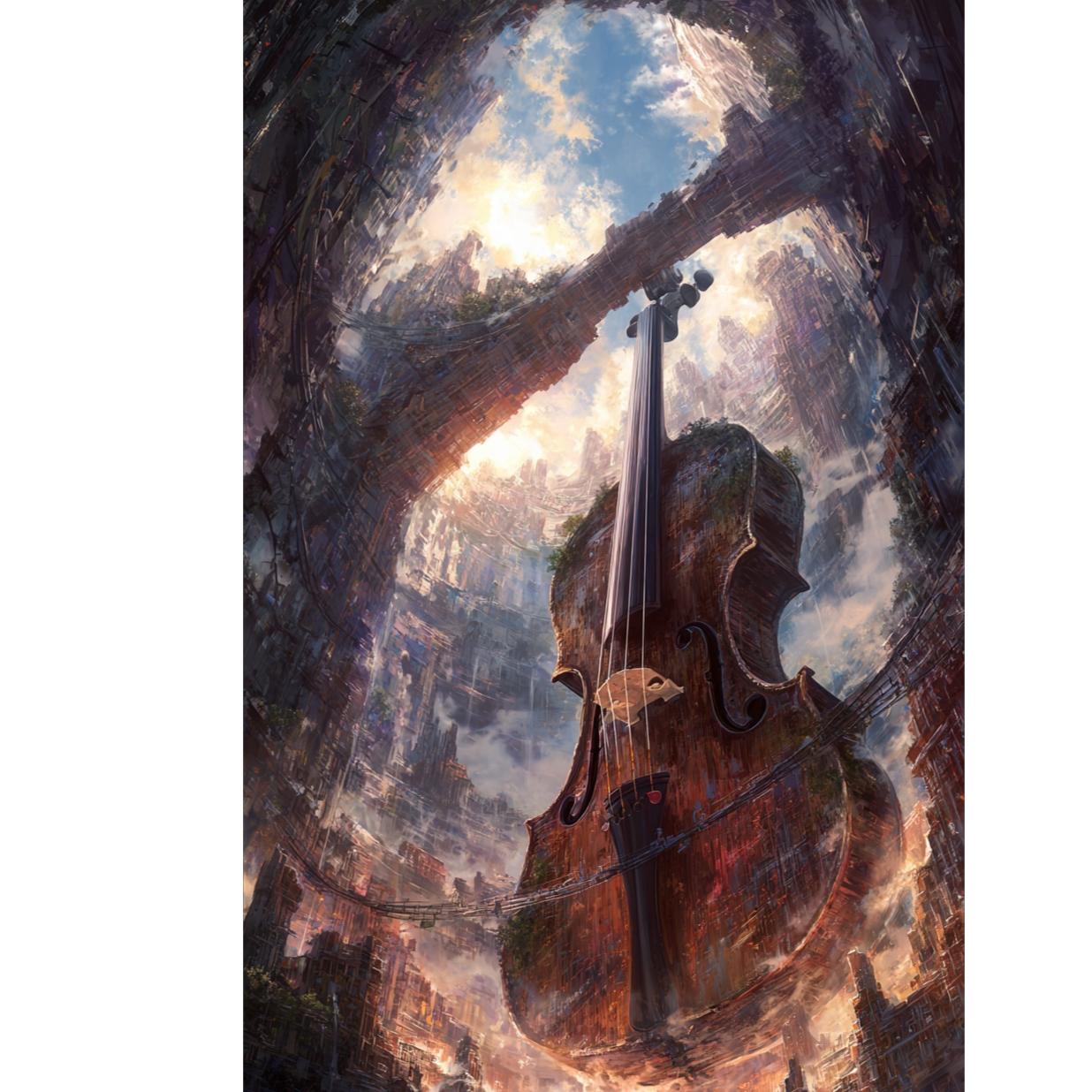 [violin and double bass POP-jazz-rock instrumental], [inspired by a colossal world tree whose branches stretch across realms and time], [majestic main melody with organic motifs and flowing tempo, echoing growth, connection, and ancient rhythm], [dynamic sections—awakening at the tree’s roots, duels among swaying branches, explosive peak as leaves shimmer in radiant light, tranquil finale as the tree breathes in silence], [expressive violin with soaring natural phrases, earthy glissandos, and sustained tones like wind through leaves, grounded by deep resonant bass like the pulse of the earth], [guitar riffs and counterlines mimicking rustling foliage and distant thunder], [jazz-influenced drumming with rolling toms, soft snare taps, and cymbal swells like seasonal winds]