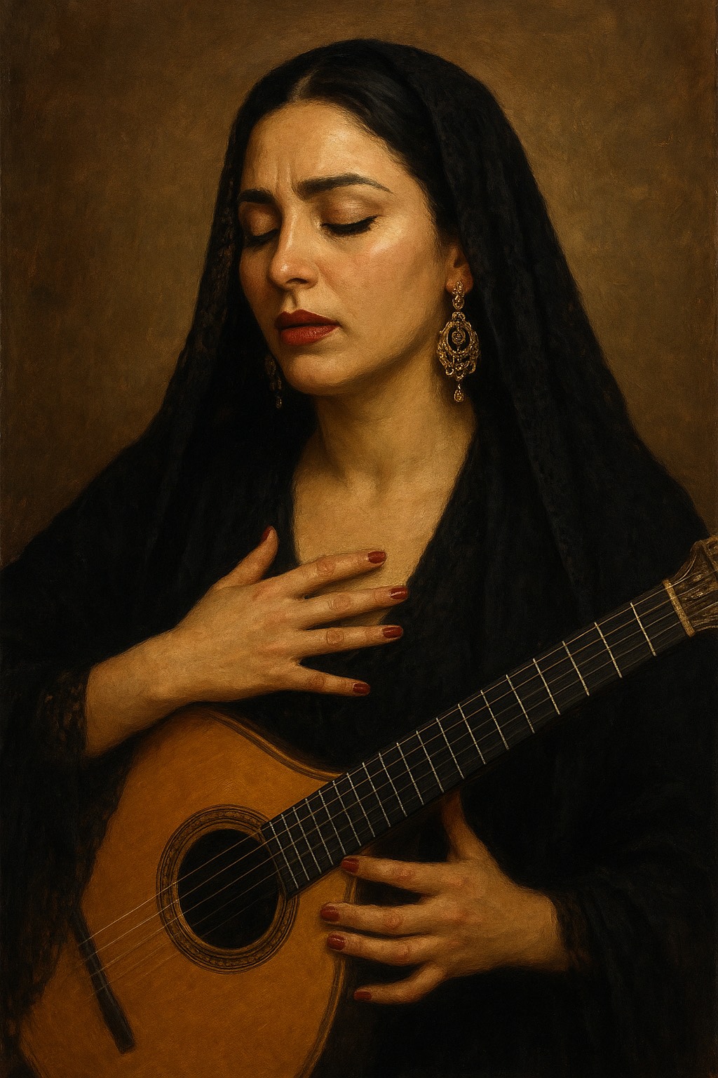female vocals, dramatic and soulful, deep, rhythmic, fado, dramatic, modern fado with portuguese guitar and bombos, soulful, warm
