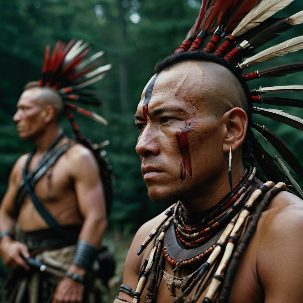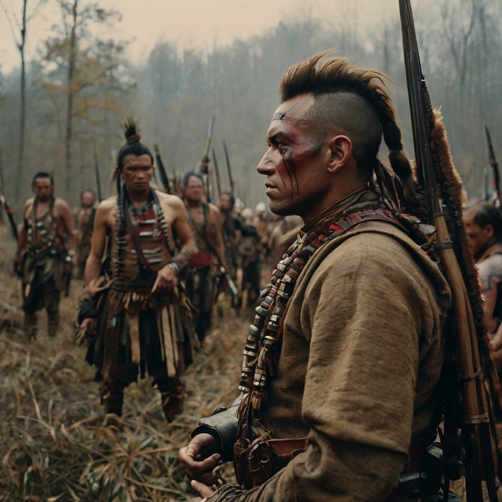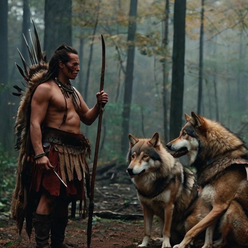 Heroic and adventurous themes with sweeping strings, bold brass, and dynamic percussion for battle and exploration scenes, Tender, emotional motifs with soft strings, flute, and gentle piano for romantic and intimate moments, Authentic Native American influences, including tribal drums, woodwinds, and subtle vocal chants, blended naturally with orchestral elements, Nature-inspired flowing melodies reflecting forests, rivers, and mountains, evoking vast wilderness and majestic landscapes, Suspenseful motifs with low brass, dissonant strings, and percussive tension hits for danger, ambushes, and dramatic encounters, Rich cinematic dynamics with smooth transitions between adventure, romance, tension, and cultural motifs, Tempo: moderate to slow for emotional scenes, fast and energetic for battle sequences, Instrumentation: full orchestra with strings, brass, wo