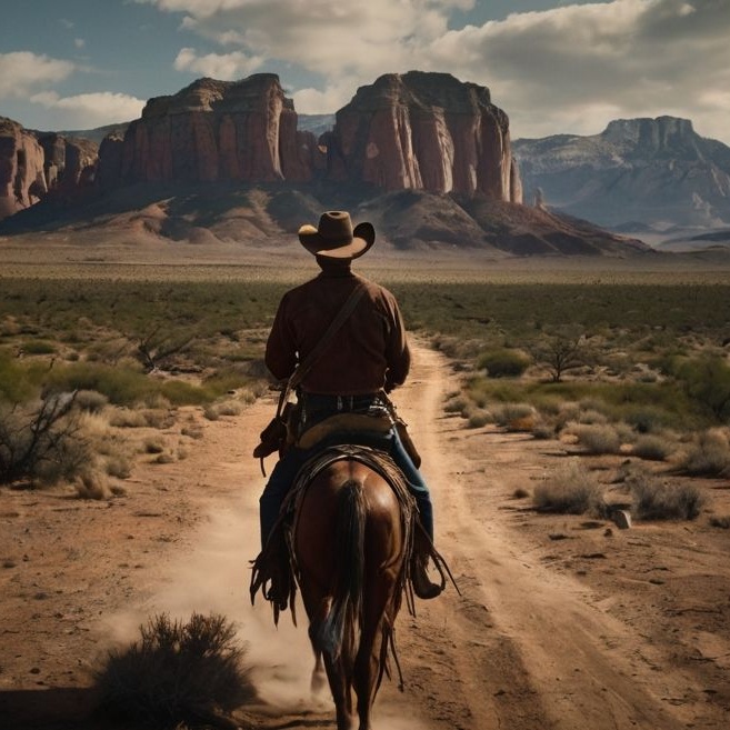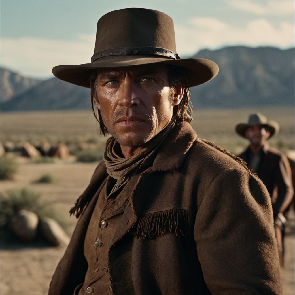 Create an epic, dramatic instrumental theme for a Spaghetti Western film, The track should feature a twangy electric guitar with heavy spring reverb, whistling melodies, a haunting male choir humming, sharp orchestral strings, mariachi-style trumpets, and steady snare drum rolls, Include acoustic guitar strumming, galloping percussion, and melancholic harmonica phrases, The mood should shift between tension, heroism, and dusty solitude, evoking images of endless deserts, lone cowboys, and intense duels at sundown, The tempo should be moderate, with wide, cinematic dynamics and bold instrumental breaks