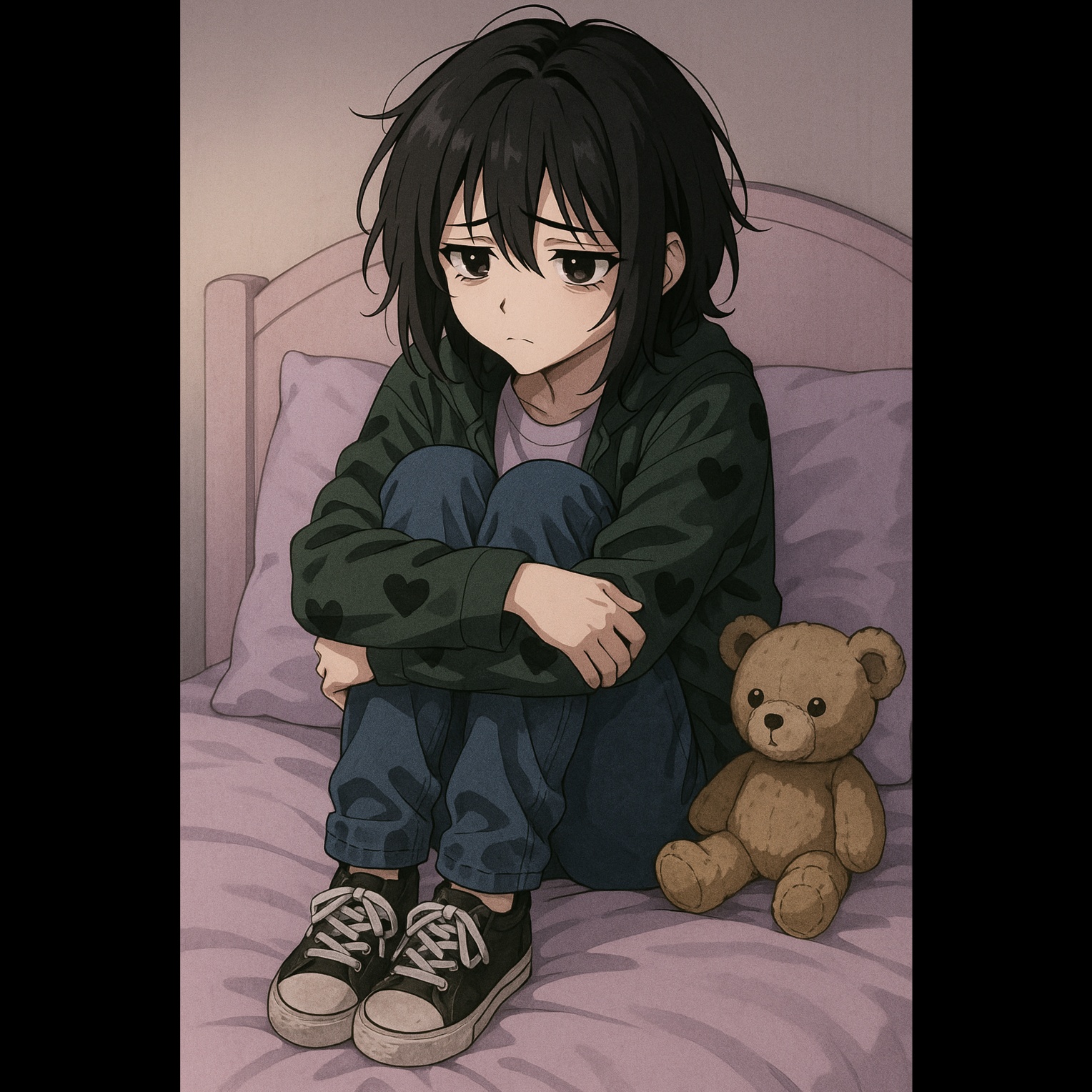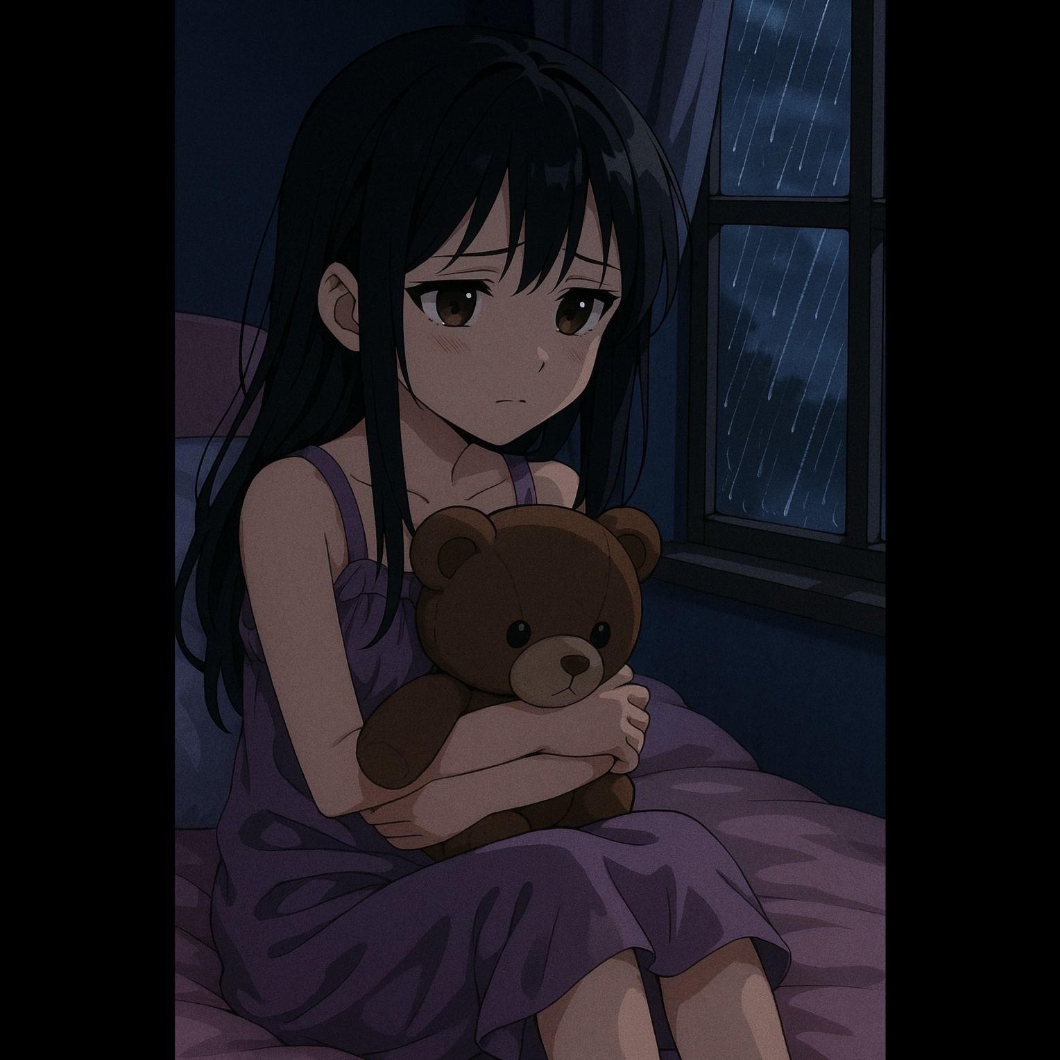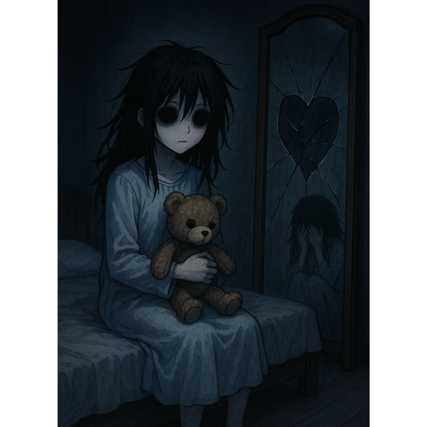Darkwave and lofi lullaby textures blend around soft, shy female vocals layered with ethereal harmonies, Kalimba sparkles over melancholic synth pads, while brooding alt pop beats pulse beneath, Reverb-drenched vibraphone adds chill, midnight atmosphere, Ominous, dreamy bedroom pop prevails