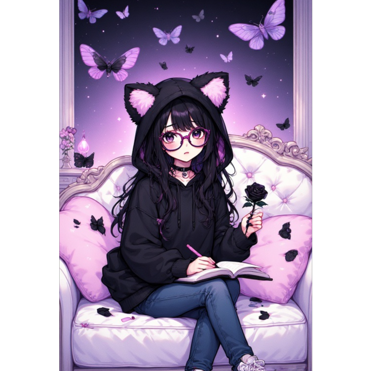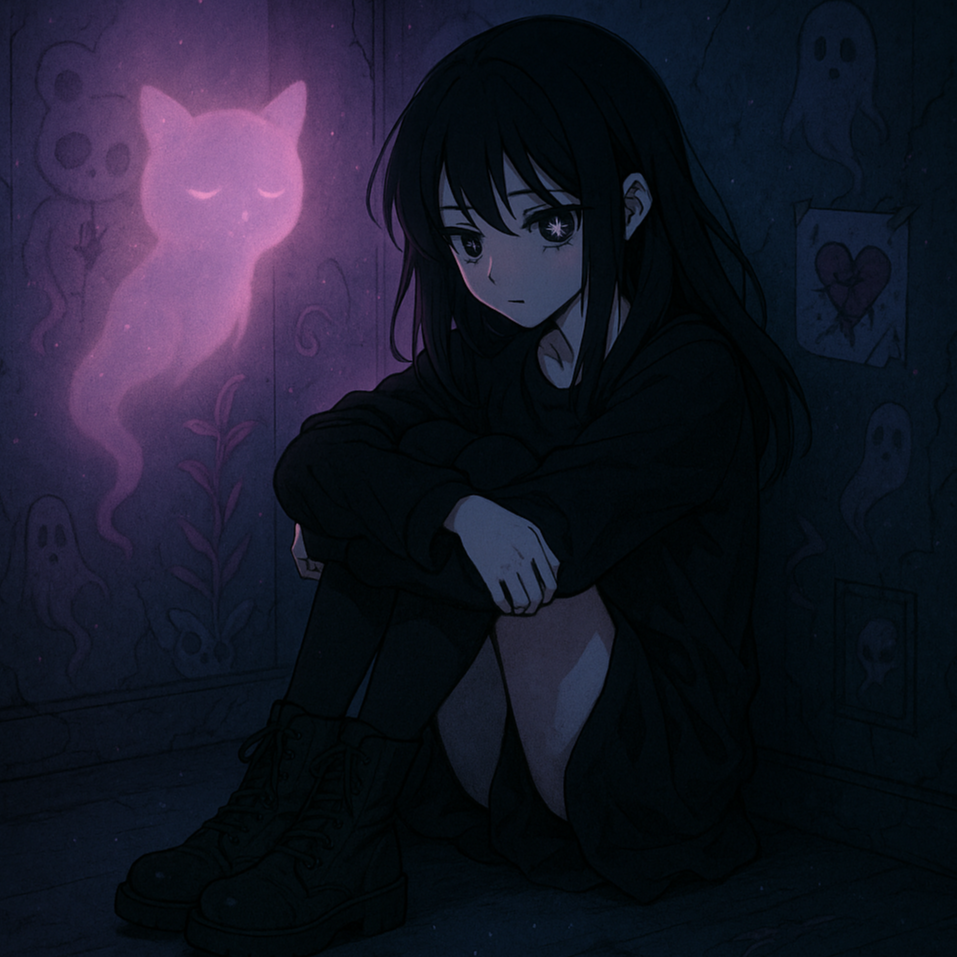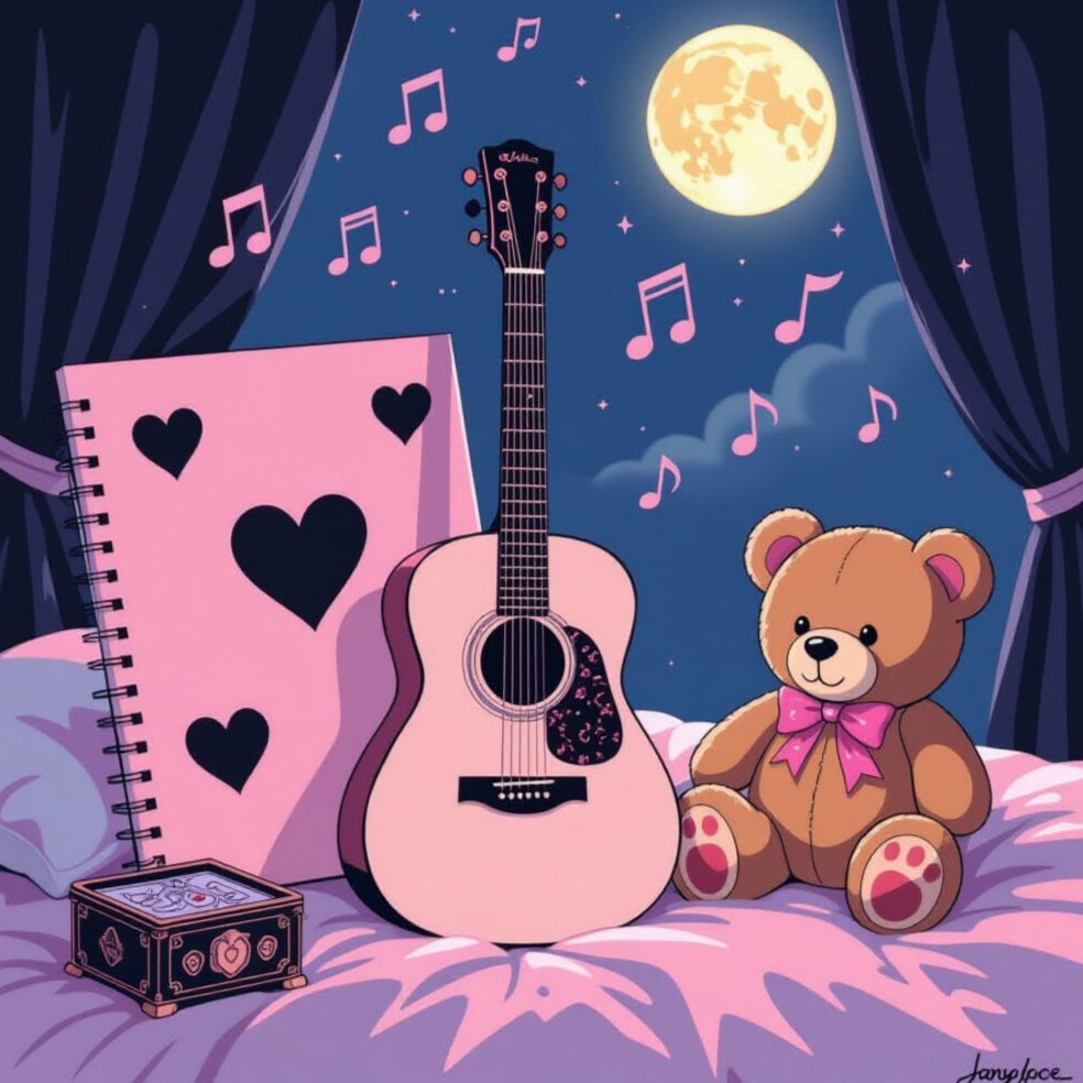 Opening with mbira plucks layered over lush pads and distant nocturnal field recordings, sweet, shy female vocals float above pulsing darkwave bass and minimalist chill emo beats, Synth arpeggios and alt pop textures interlace, creating a dreamy, nocturnal dark bubblegum pop atmosphere