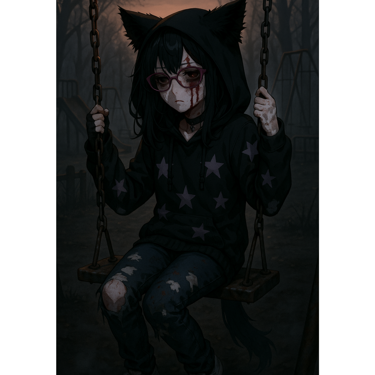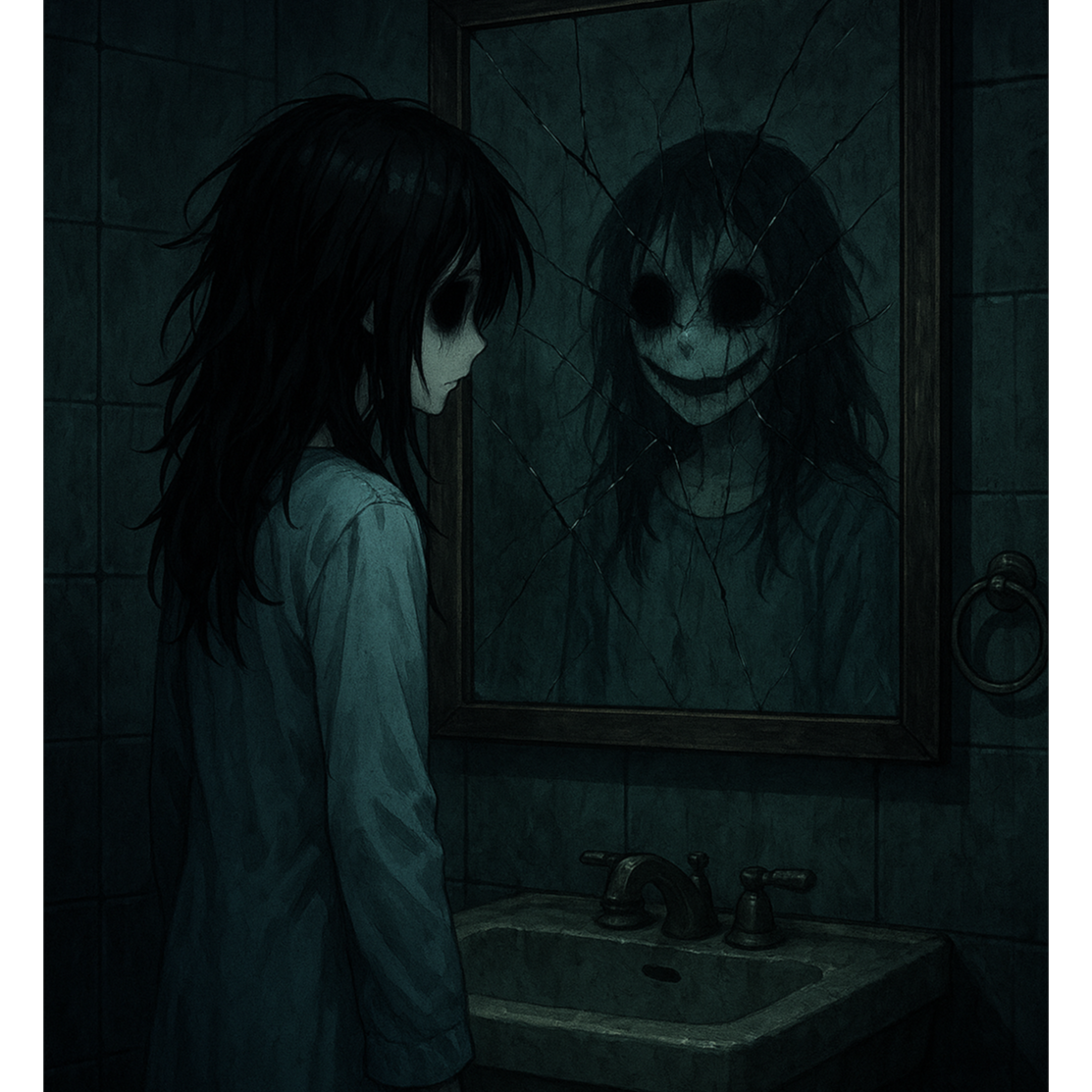 The song opens with haunting piano, ominous mbira, and a delicate music box motif, layered over subtle acoustic plucks, Shy but sweet female vocals drift in, enveloped by hard-hitting bass and punchy trap-influenced beats, Sharp darkwave synths and alt rock guitar textures build tension in the chorus, where doomcore-inspired drops add depth, Dense, atmospheric layers blur dark bubblegum pop, darktrap, and alt rock, creating an eerie yet infectious soundscape throughout