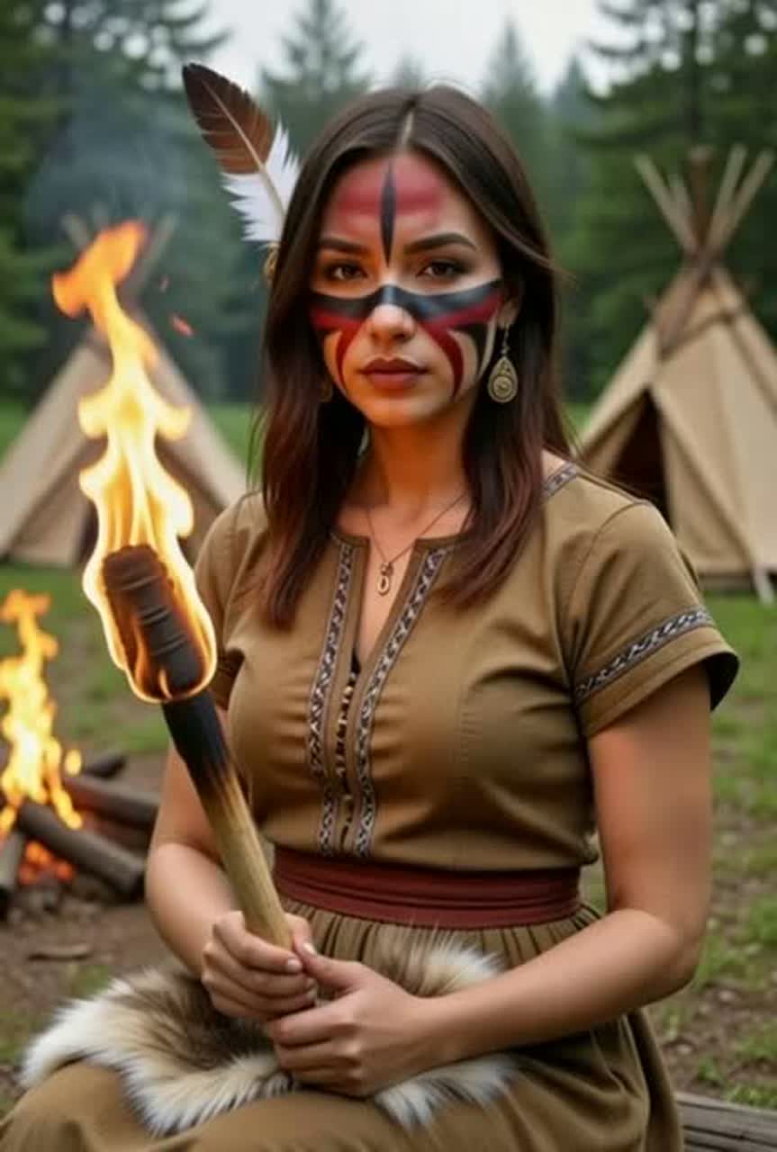 Instrumental metalcore track with strong Native American influence, Slow to mid-tempo heavy groove (90–100 BPM), Deep tribal drums and frame drum as rhythmic foundation, mixed with modern metalcore drums and low-tuned guitars, Native American flute in minor pentatonic, breathy and raw, used as a recurring motif, not virtuosic, Subtle tribal chants and ritual shouts in the background as texture, Long ritual intro with flute and drums, heavy groove-driven riffs, one tribal breakdown with percussion in front, atmospheric outro with flute and drums only, Dark, earthy, ancestral, powerful, [Female vocals]