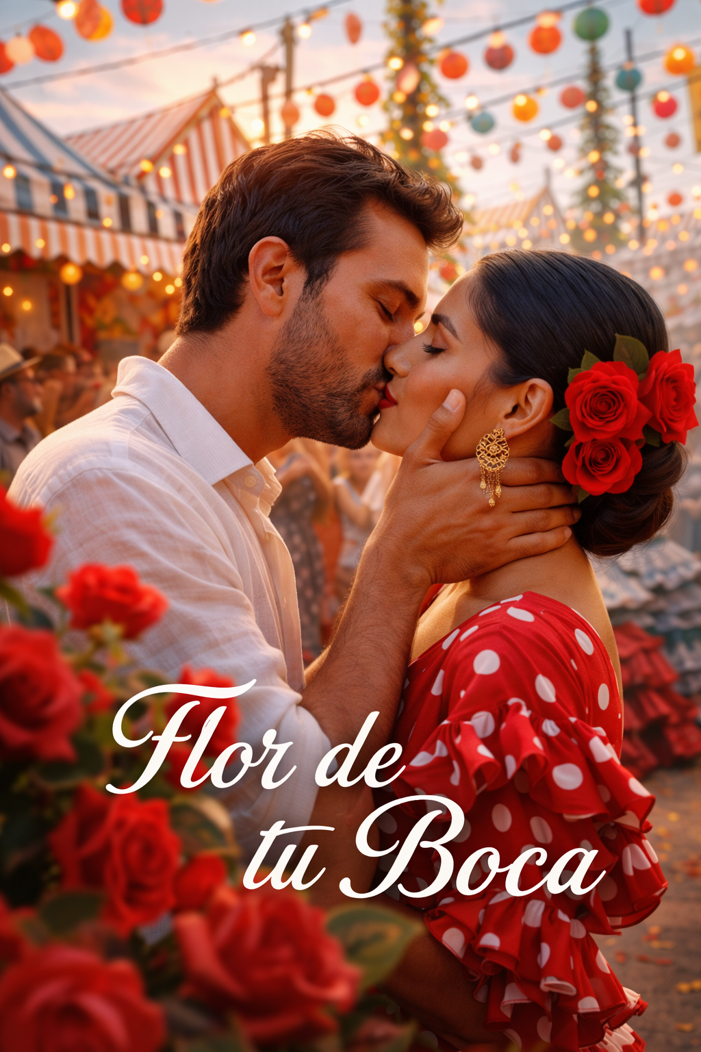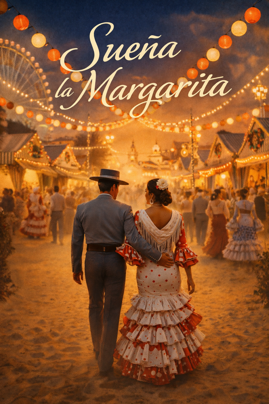 Sevillanas tradicionales, guitarra española marcada, palmas rítmicas, voz masculina cálida, ambiente de feria andaluza, estribillo pegadizo, ritmo bailable, aire costumbrista, evocando imágenes de flores, amor y alegría de feria, La estructura respeta las clásicas coplas y estribillos de la sevillana, manteniendo un espíritu festivo, familiar y elegante durante toda la canción, con transiciones suaves y finales redondos