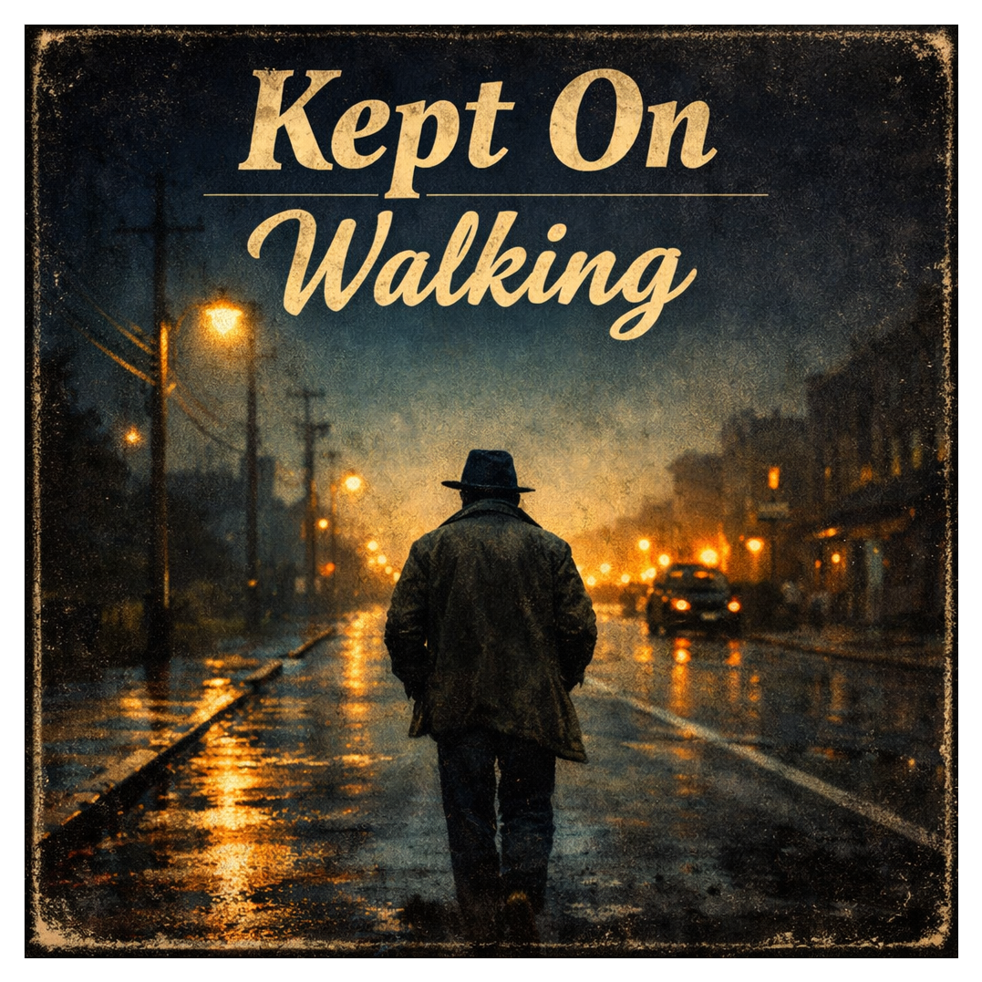 A dark, grounded blues-folk track with a steady mid-tempo shuffle feel, relaxed but always moving forward, The song is led by warm acoustic guitar, strummed and lightly fingerpicked in a constant, walking rhythm that anchors the groove from start to finish, A gritty double bass walks beneath the guitar with clear, rolling lines, giving weight and momentum, Bodhrán provides a firm, earthy pulse, heavy in the step but unhurried, reinforcing the forward motion without rushing, Subtle violin phrases and low cello lines appear sparingly, adding tension and depth without slowing the groove, The arrangement stays raw and intimate, leaving space for the voice, Midway through the track, a blues guitar solo emerges, slightly overdriven and expressive, The solo is muscular but restrained, bending notes slowly, answering the vocal lines rather than overpowering them, then settling back naturally into the rhythm, Overall mood: earthy, defiant, road-worn blues with folk roots, steady movement, e