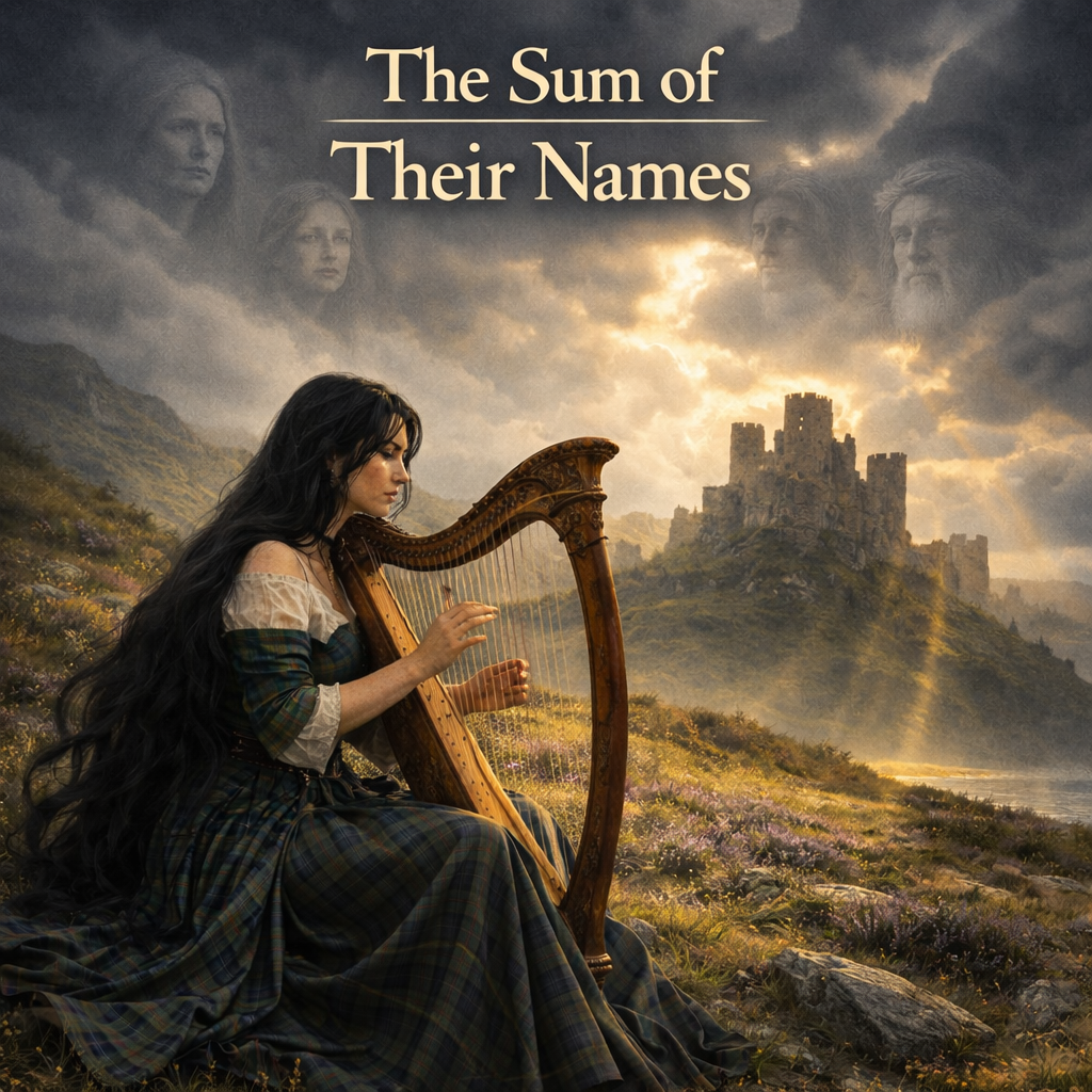 An emotional, dark folk–blues–influenced bardic anthem for a single female voice with a steady, flowing mid-slow tempo, Driven by acoustic lute, enchanting Celtic harp, deep resonant drums, and mournful cello in modal minor tones, The intro opens with the female voice alone, clear and controlled, haunting yet precisely articulated, accompanied by sparse, ritualistic harp arpeggios, Verses are intimate and emotionally intense, sung in a warm, focused tone with clean diction, blending folk storytelling with restrained blues phrasing, supported by open-fifth harmonies and subtle, lightly warlike percussion, Refrains rise in intensity through layered harmonies from the same voice, with harp and cello swelling in a measured, grounded pulse, dark but never blurred, The bridge strips back to voice and harp, maintaining clarity and tension, before rebuilding into a strong, unified final refrain, End with a whispered but intelligible vocal harmony over lingering harp resonance