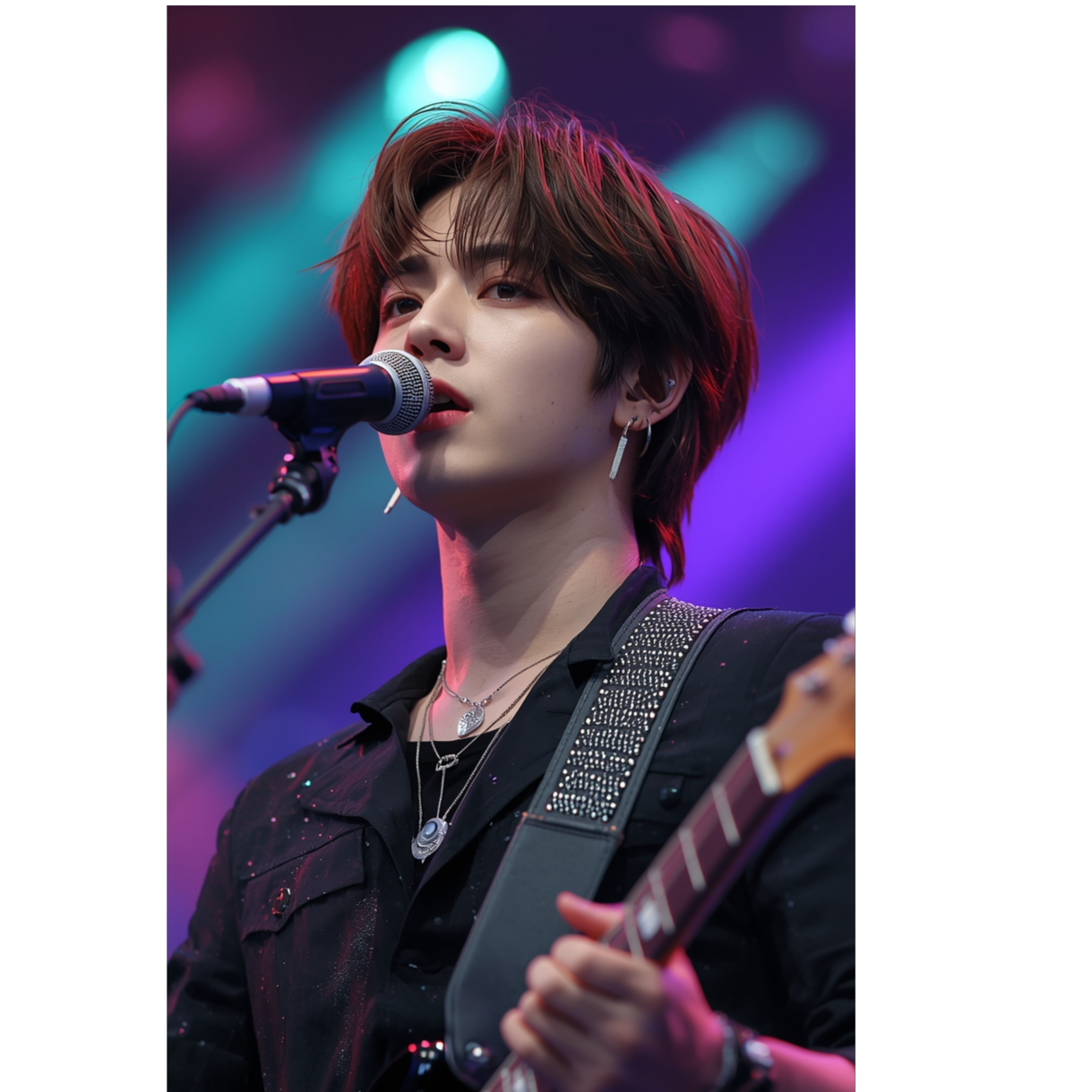High-energy J-pop × K-pop hybrid dance track, 142 BPM, key of A minor, Immediate start with distorted synth stab and kick hit, no long intro, Male rap vocals with deep, husky, aggressive tone, strong chest projection, no childish or falsetto voice, Explosive chorus with layered harmonies, bright synth lead, percussive glitch FX, and electric guitar stabs, Japanese≈70%, English≈30%, Double-time rap sections with crisp consonants and end-rhyme focus, No slowdowns or instrumental breaks, Outro single hit, instant stop (no fade, no long outro)
