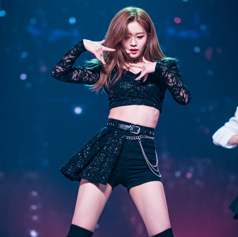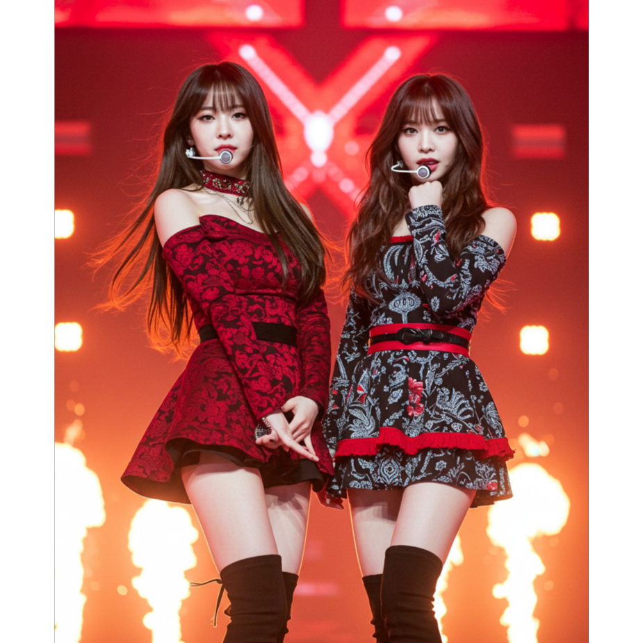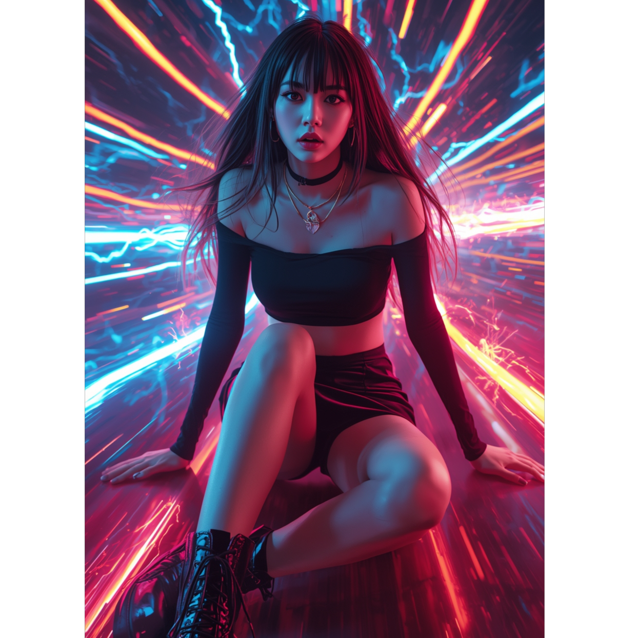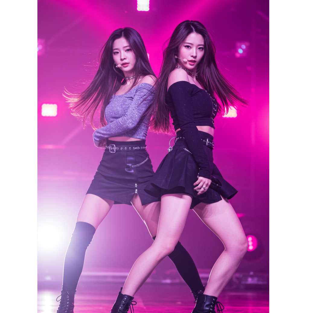 142 BPM, Key A minor, 2025 J-pop girl-group dance track with immediate high energy, Intro starts with electric guitar riff + tight kick-snare, no hums or filler, Verse 1 begins instantly with fast, rhythmic rap (syllables locked to kick pattern) over driving bass and syncopated hi-hats, Pre-Chorus keeps rapid rap layered with short melodic phrases to maintain momentum—no tempo drop, Chorus explodes with bright lead synth, layered harmonies, and a catchy 2-bar hook; guitar and synth trade accents, Mid-song rap break with half-beat groove and sub-bass, then return to full drive, Japanese≈70%, Korean≈30%, crisp consonants for percussive delivery, Avoid clichés (“始まりだ, 行こう, 燃え上がれ, 止められない, 光”), avoid repetitive title chants—title appears only once per chorus