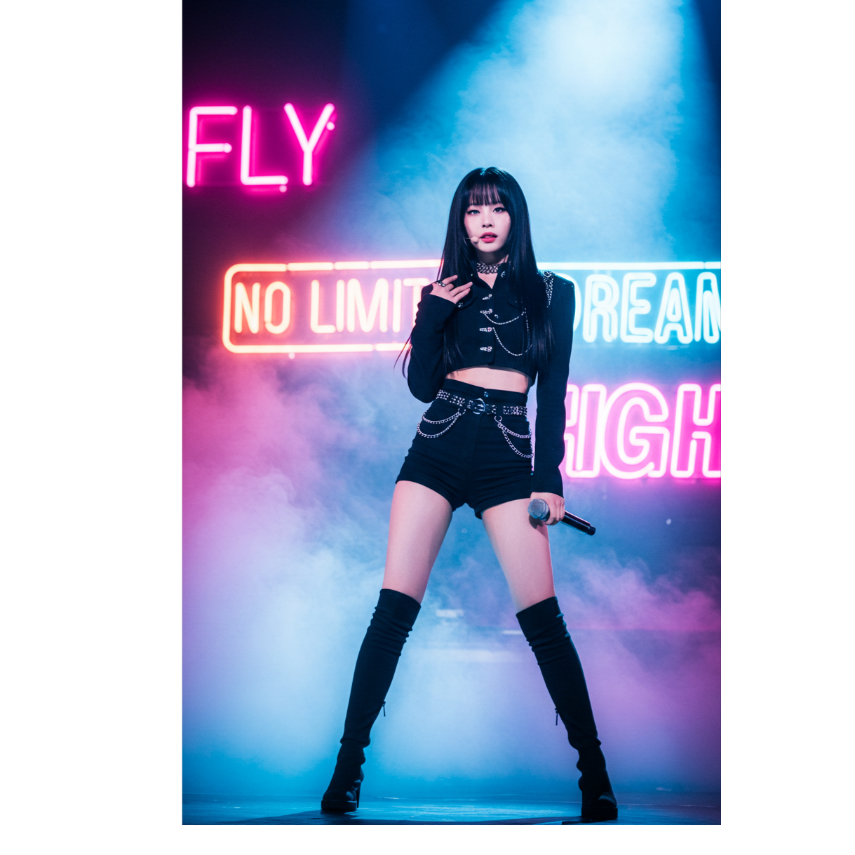 High-energy J-pop/K-pop hybrid dance track, 152 BPM, Fast Japanese rap verses + melodic English hooks, No pre-chorus, smooth transitions with high tension, Punchy drums, layered synth bass, sharp hi-hats, crowd-chant FX, Vocals intense, confident, no slowdown, no extended outros, Designed for modern 2025 idol stage performance with addictive chorus repetition