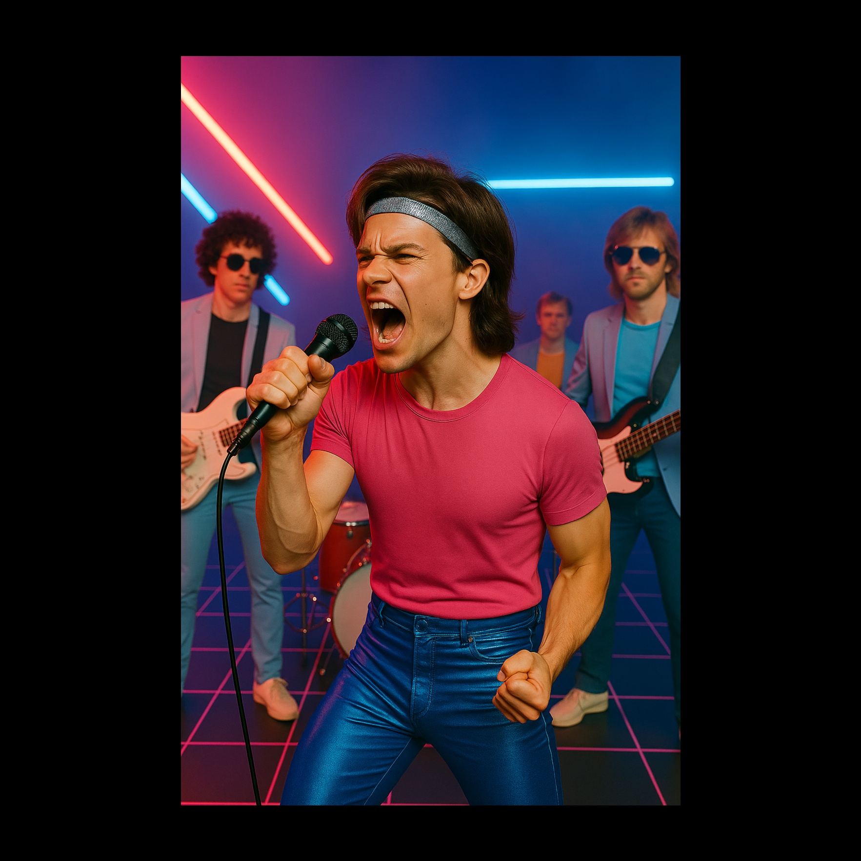 80's flashback classic sportscar, electronic guitar riffs, male voice, male voice, male voice, male voice, ‑female voice