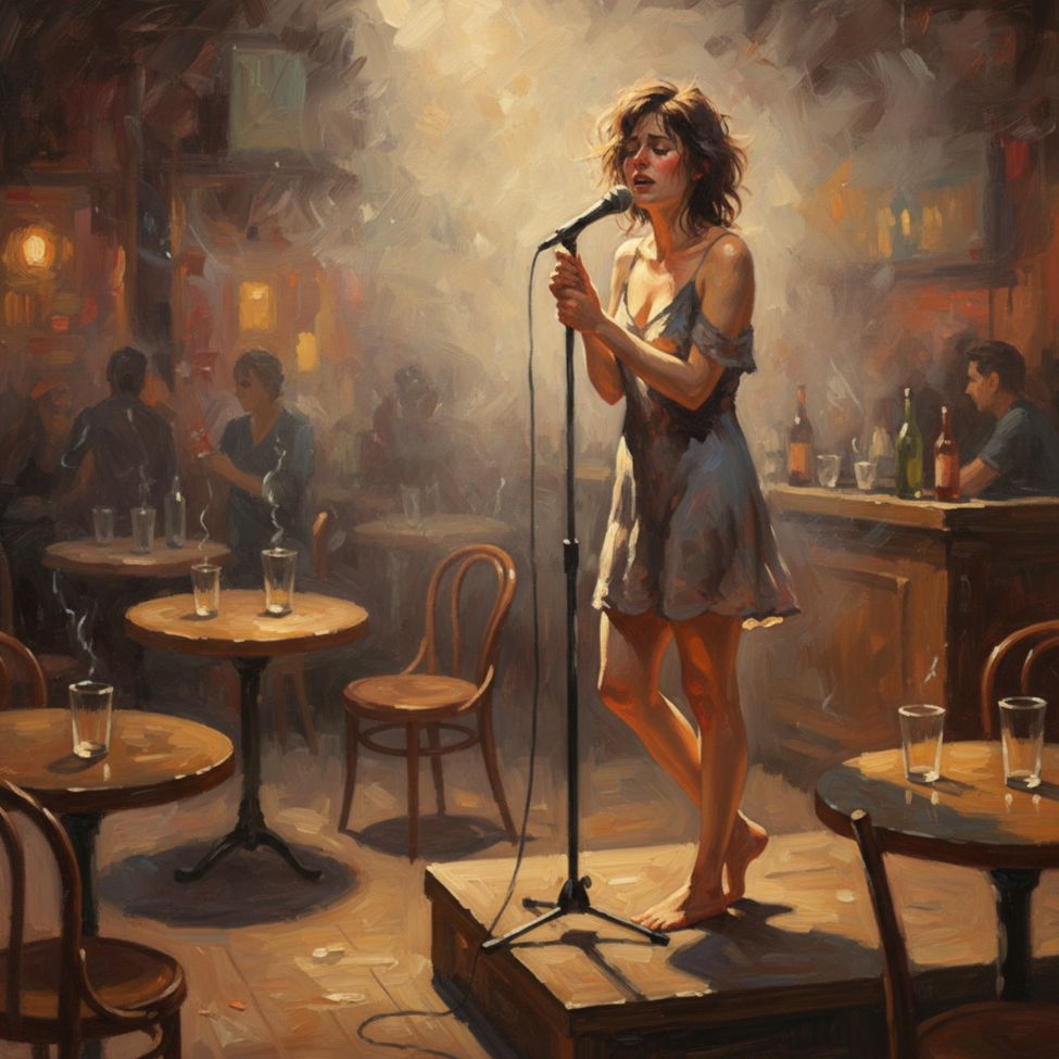 The atmosphere of a small, smoky cafe, On a tiny stage, a girl with a high-pitched, sobbing, crying, breaking, slightly intoxicated voice, but still very much wanting to have sex with the man she's singing for, accompanied by relaxed instrumental music, long guitar riffs, acoustic guitar, emotional piano, trip-hop, indie pop, soul ballad, piano accents and solos, bass synthesizer, repetitive, sad guitar, rock punk, modern indie, and a touch of blues