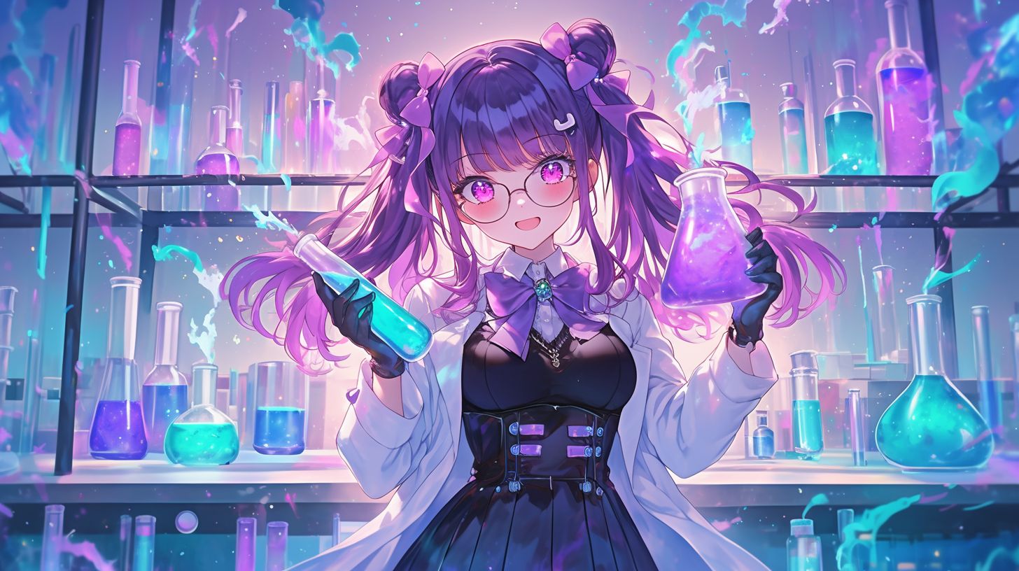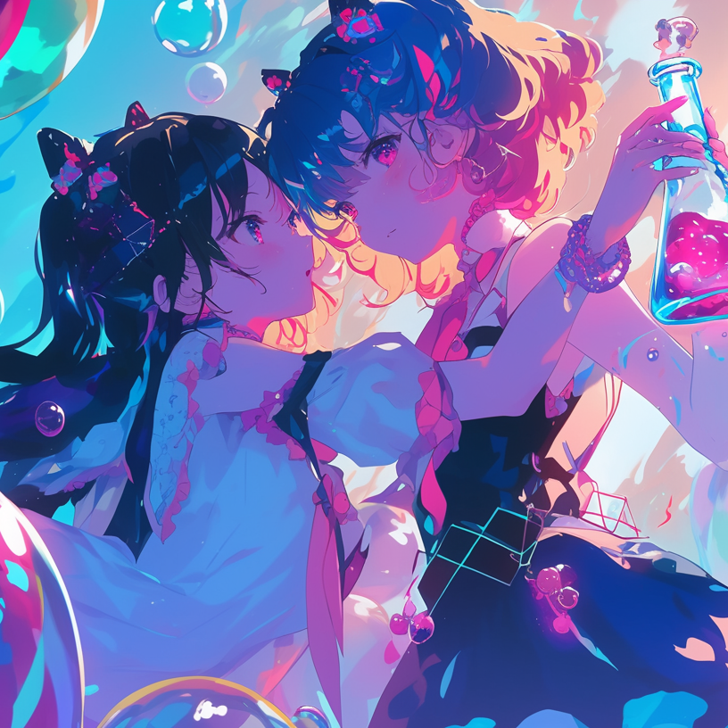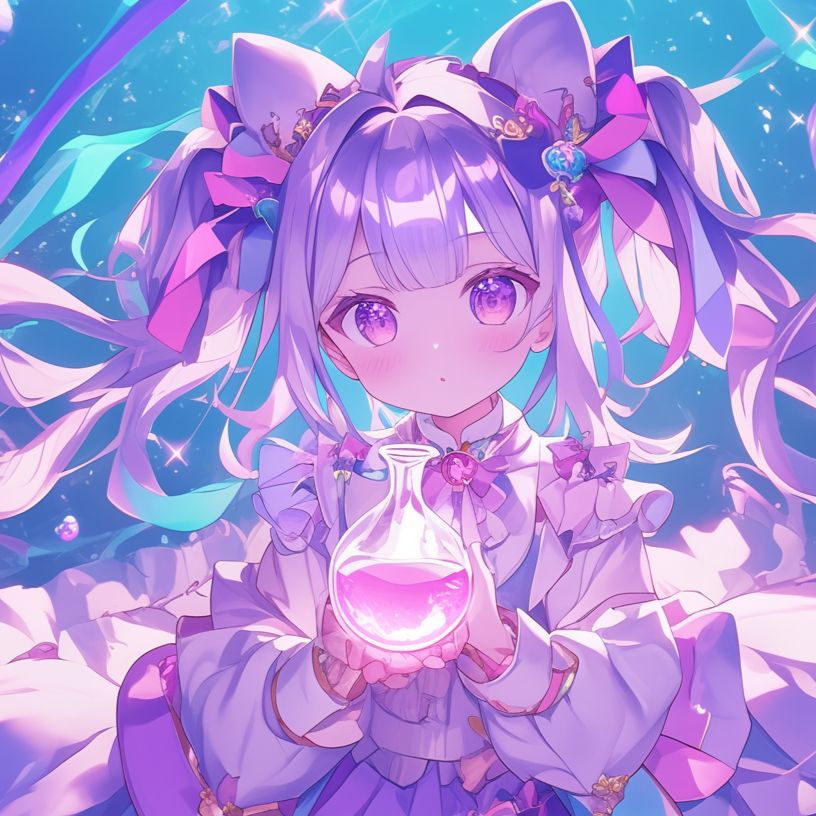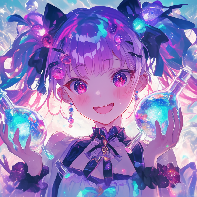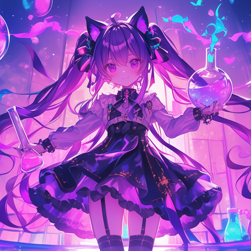 Mood: magical, dreamy, neon-lit, candy-colored, kawaii and whimsical, Keywords: kawaii, neon, alchemy, potion, ca