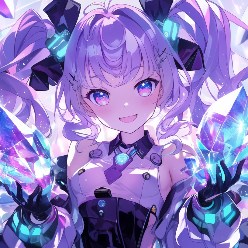 Kawaii Future Bass track called "Crystal Catalyst", Tempo around 153 BPM, Playful yet sparkling atmosphere with candy crystals and catalyst fantasy theme, Instruments: glittery synth leads, shimmering supersaws, pastel toy piano, crystalline bells, glassy sound effects, bubbly pads, and punchy sidechained drums, Include kawaii vocal chops ("chu", "wow", "spark") blended with dreamy female vocals singing in Japanese and English hybrid lyrics about candy crystals, light, catalysts, and sweet reactions of love, Structure: