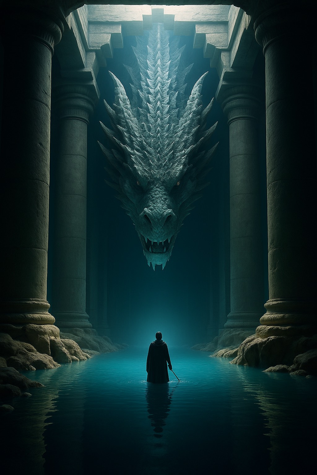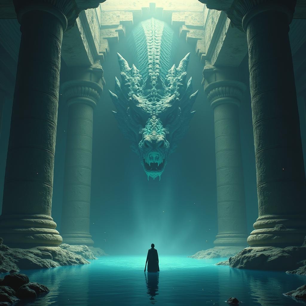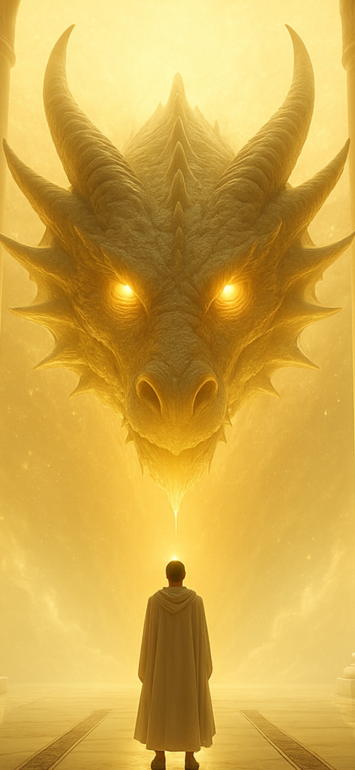 Ancient Egyptian ceremonial music for a trial before the Dragon of Light — deep resonant harp drones, bright lyre arpeggios, airy end-blown flutes, and shimmering metallic sistrum, Powerful, steady frame drums in slow 6/8, with droning double-pipes, Female lead vocal in a soaring, melismatic style, joined by a chorus in call-and-response, Modal scale with bright, piercing high notes to evoke blinding sunlight, Atmosphere is radiant, awe-inspiring, and unyielding, as if standing before the cosmic truth itself