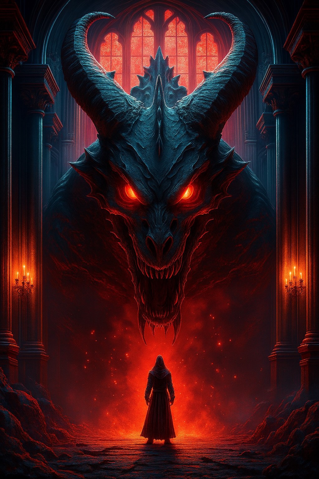 Gothic symphonic metal, 60 BPM, solo piano intro, cathedral pipe organ, high-gain melodic electric guitar solos, dramatic choirs in Latin, cinematic drums, haunted castle doom energy
