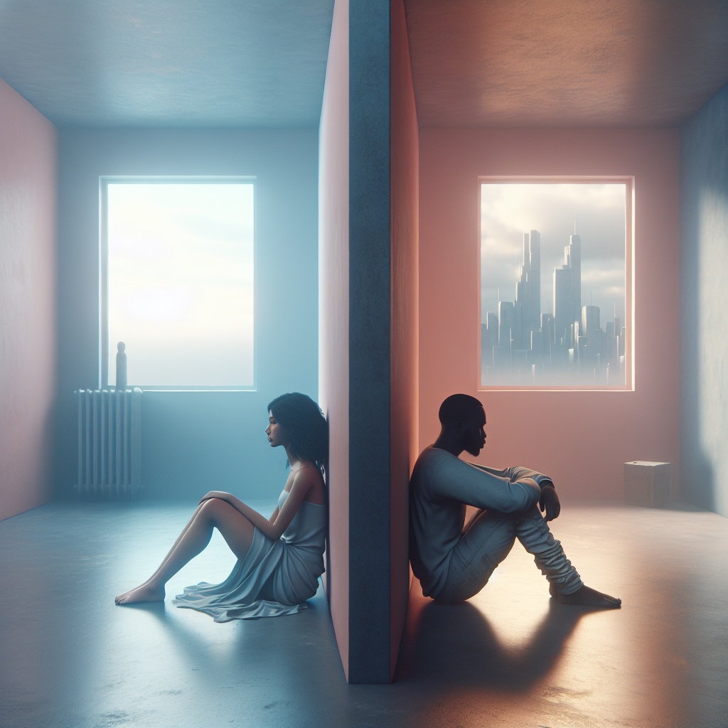 Melancholic lofi house track at 130 bpm, built on a minor-key structure, Opening with vinyl crackle and a filtered piano accompagnement, then layered with a catchy, deep bassline and crisp, spacious four-in-a-line beat house drums, and a sad and slow saxophone, Subtle dub techno textures weave through, with short, rhythmic rap lines accentuating select breaks, For the vocals, it's a duet of a male and female, The male vocals: deep, clean, calm, and emotional voice, The female vocals: high, clean, calm, and sensual voice, The intro is spoken by the male vocals, The verse 1/5/7 and interlude is sang by the female vocals, The verse 2/4/8 is sang by the male vocals, The verse 3/6/9 is a dialogue from both male and female (male starting first)