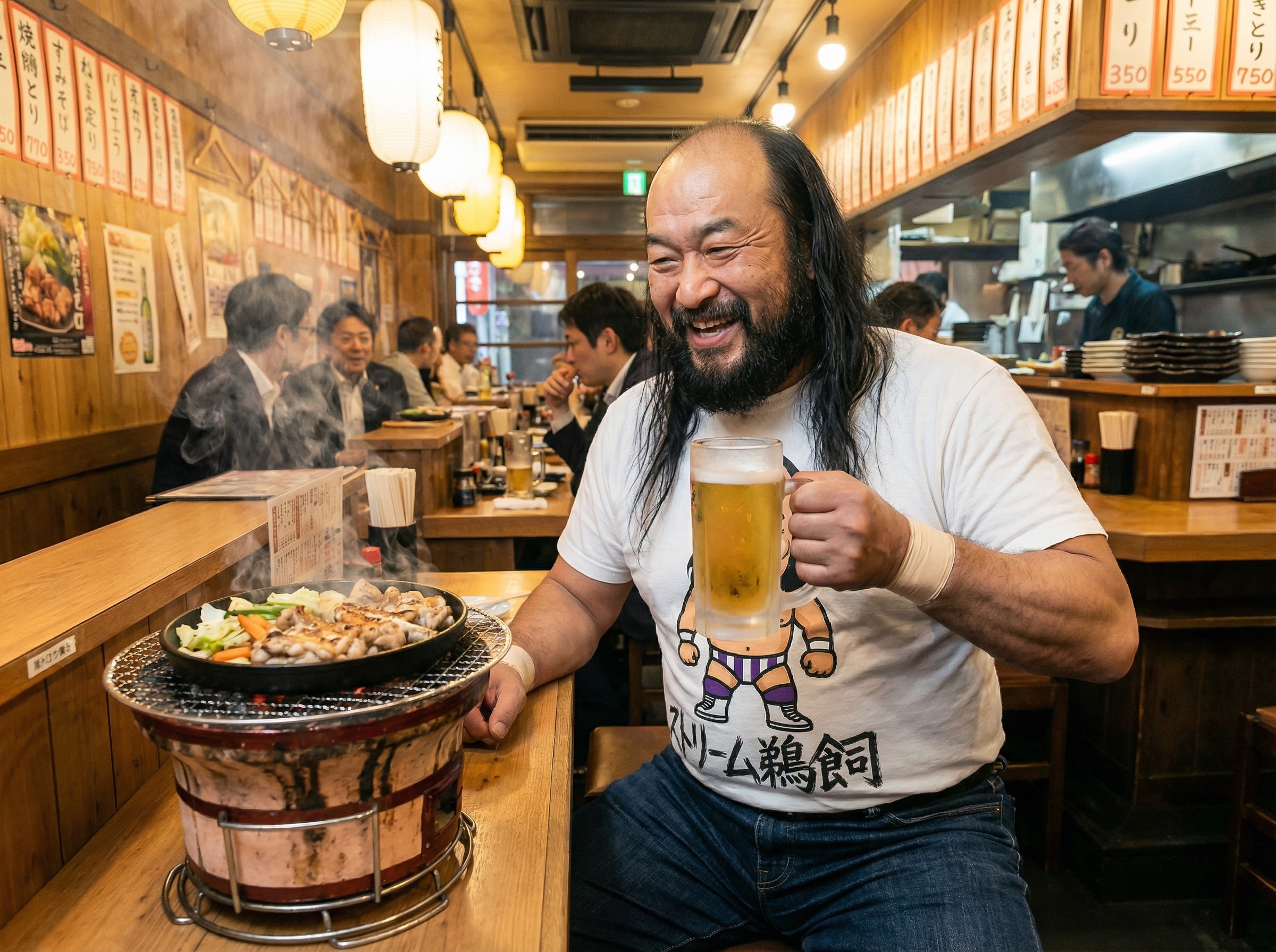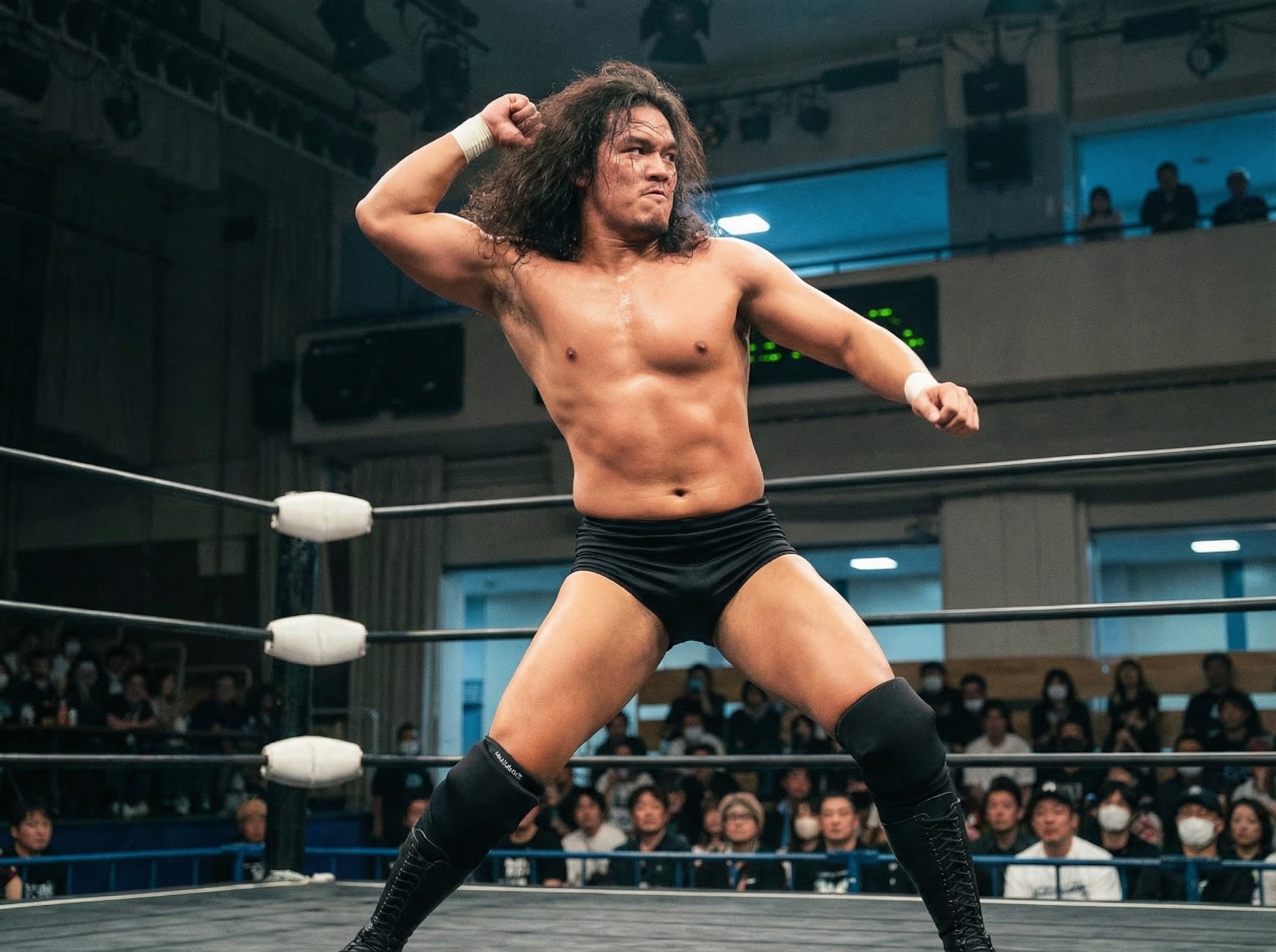 2015 Japanese modern wrestling entrance theme, instrumental, Catchy but slightly arrogant and provocative, Tempo 122 BPM, key D minor, Immediate aggressive guitar riff intro with half-step slide, Short repetitive 2-bar hook that instantly sticks in the head, Layered distorted guitars, tight and rhythmic, Punchy modern drums, driving 4/4 with sharp snare, Deep groove-oriented bass, Sharp brass stabs accenting the main riff, Minor progression with unresolved tension (avoid full major resolution), Hook repeats several times to create anticipation, Mood: confident, slightly smug, urban tension, divisive middle-aged fighter entering the arena, Memorable, chant-like instrumental motif that could trigger crowd reaction, Not metalcore, not EDM, not overly heavy
