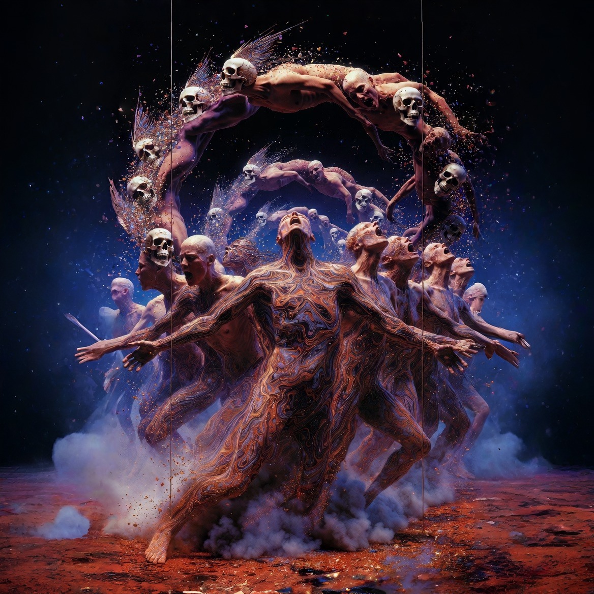 progressive rock, psychedelic rock, post-hardcore, alternative, avant-garde, cinematic, dynamic guitar, 112-115 BPM, 4/4 with occasional 5/4 shifts and polyrhythmic undercurrents, heavy low-end swerving groove, dark exotic Phrygian dominant tension with raised third and lowered second, palm-muted chugs into fluid hammer-on pull-off Phrygian licks, dense layered instrumentation, atmospheric clean tones with deep reverb and delay, heavy distorted walls with tight low-end punch, thick saturated guitar tone with feedback swells, ethereal breathy male falsetto and soaring raw male tenor vocals shifting from whisper to scream, restrained groove with subtle swing and push-pull feel, Tool-style polyrhythmic drum tension and war-drum builds, psychedelic atmosphere, cinematic builds, low tuned weight, faint shaker pulse only