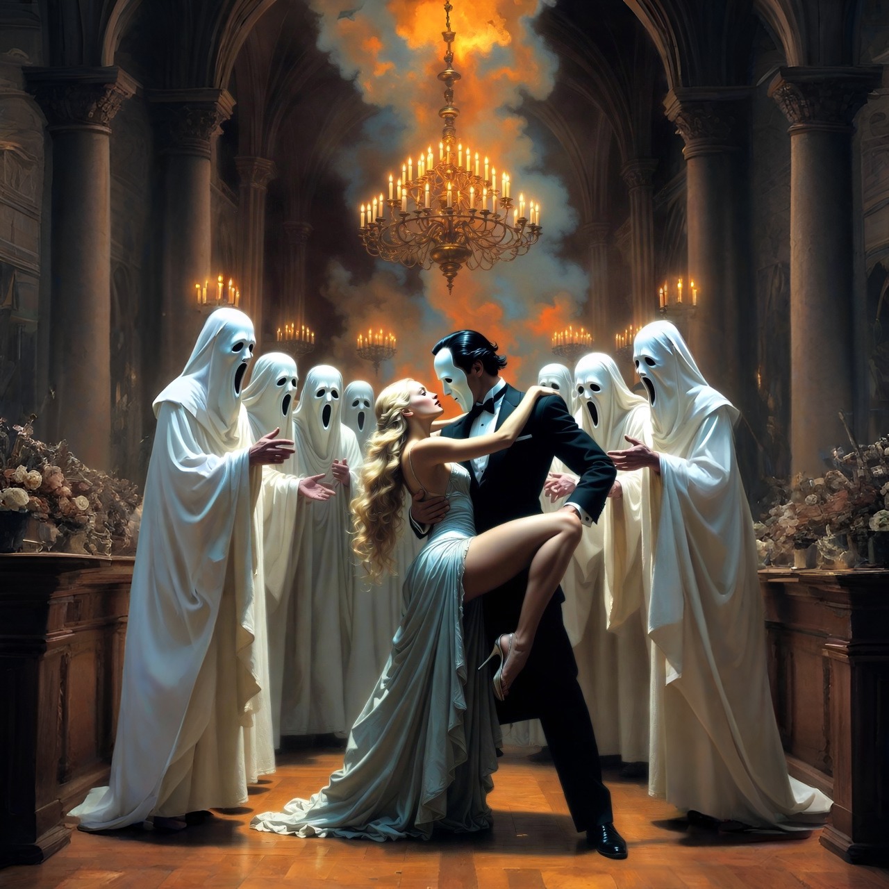 progressive psychedelic indie-pop alt-dance with latin-jazz fusion and salsa percussion, sleek groovy electronic rock with French indie strut, avant-garde cinematic spooky supernatural atmosphere, dense layered instrumentation, shimmering jangly guitars with dynamic leads, funky bass-forward groove and weird percussive flair, vibrant afro-cuban congas bongos timbales and salsa rhythms driving the pulse, hard-hitting yet danceable electronic drums with industrial edge, subtle eerie atmospheric synth pads, detuned house piano stabs with punchy off-kilter chords adding dissonant tension, tubular bells ringing with haunting cinematic resonance and distant tolling, processed demonic vocal chops blended with soaring ethereal male falsetto and tenor vocals, pitch-bent haunting effects, menacing stylish groove, evolving progressive structures, ‑bongos, ‑steel drums