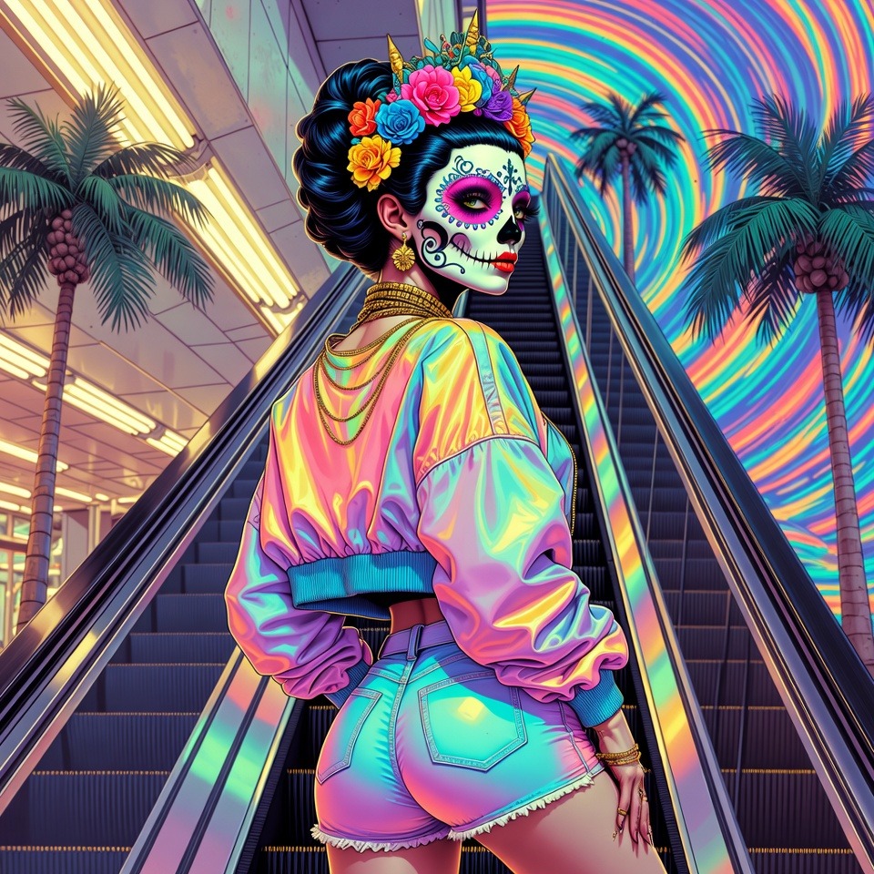 progressive rock, psychedelic rock, latin-jazz fusion, salsa, afro-cuban rhythms, post-hardcore, math rock, dense instrumentation, dynamic guitar, male falsetto, ethereal vocals, fused with vaporwave mallsoft, glitchy dreamy lo-fi synths, heavily slowed chopped and screwed samples, retro mall ambiance, soft neon glow, reverb piano, heavy analog hiss, heavy VHS distortion, tropical pads, steel drum echoes, shimmering arpeggios, hypnotic polyrhythms blending salsa with vaporwave loops, ethereal male vocals over lush glitchy layers, intricate guitar through pastel soundscapes, urgent dynamic shifts between math-rock tension and crumbling glitchy mallsoft serenity, rising unease, dissonant warm tones, heavy stuttering glitches, digital dropouts, faint mall echoes with distant alarms, unsettling F# Phrygian minor key, heavy b2 (G natural vs F#), tritone tension, unresolved minor seconds