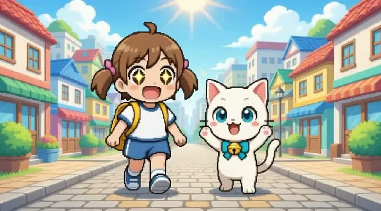 8bit chiptune town theme for a cheerful RPG adventure, Bright and bustling atmosphere with playful melodies, inspired by classic SNES-era games, Instruments include square wave leads, triangle bass, and light percussion, Tempo around 120 BPM, Suitable for a scene where a young girl and her cat companion explore a colorful fantasy town full of shops, fountains, and friendly NPCs, The music should evoke curiosity, joy, and a sense of discovery