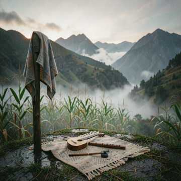 Andean and Chilean folk, charango, panflute, 80 bpm, featuring atmospheric rainstick sounds, traditional percussion, organic and earthy vibe, female vocals, duet, male vocals, harmonic chorus