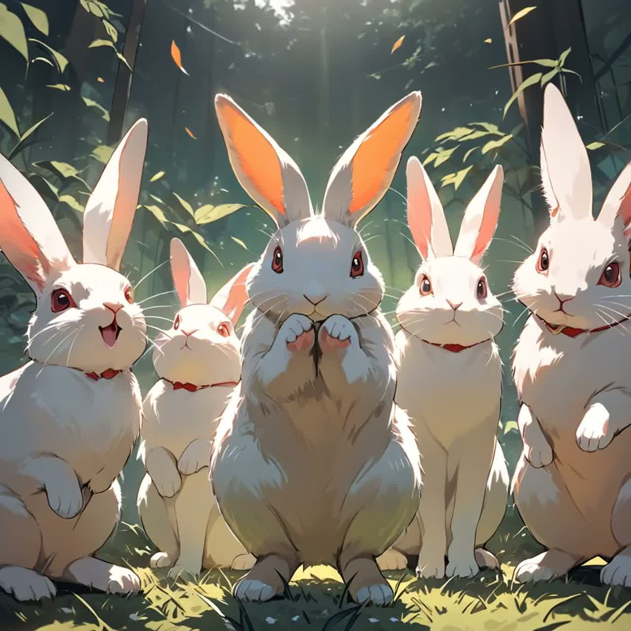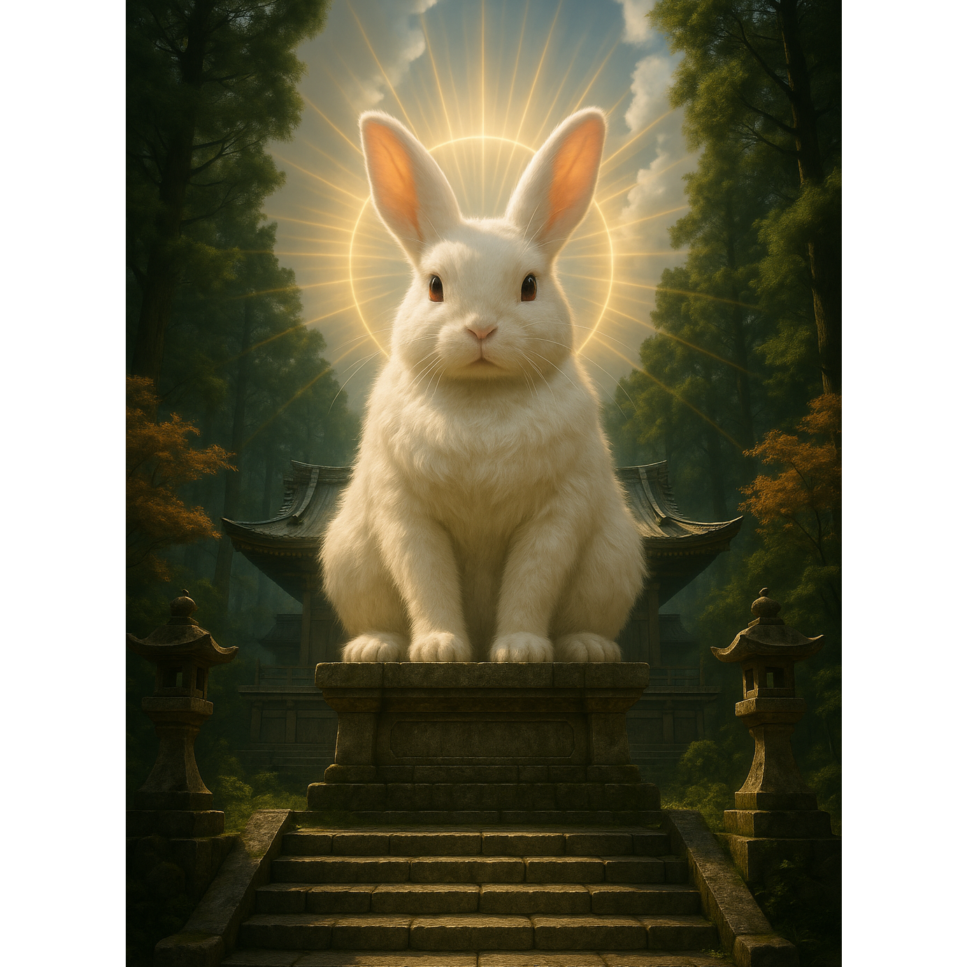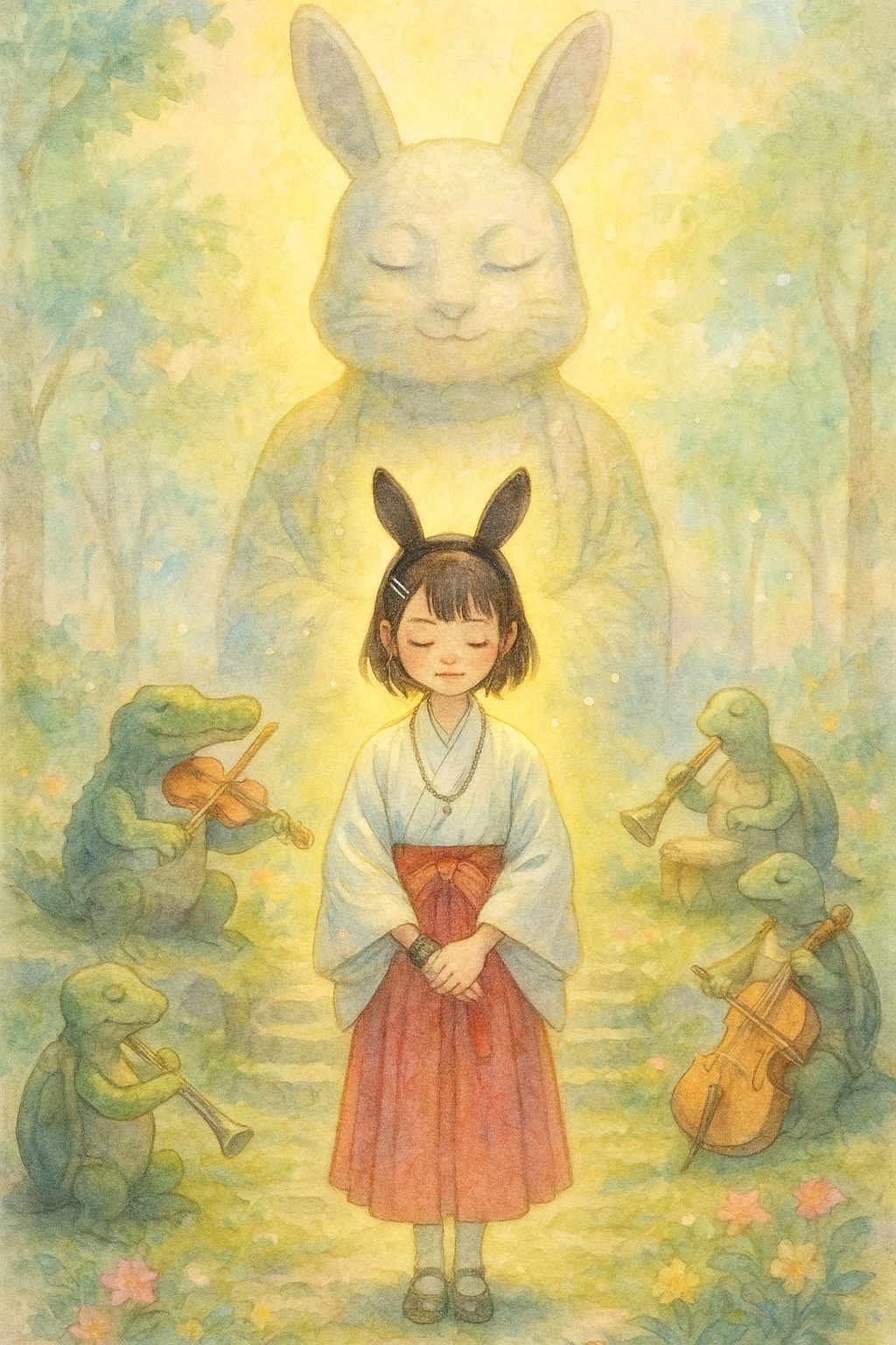 Children’s gospel choir song in waltz time, slow and majestic intro with violin leading, pipe organ and soft strings building up, bright female vocal with kids choir chanting joyfully, Japanese matsuri taiko and flutes subtly blended, chorus chanting ‘顕現!うさぎ大明神!’ in full harmony, sacred yet playful, fluffy sparkles in a graceful divine waltz, Slow