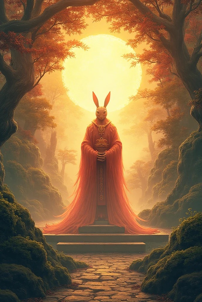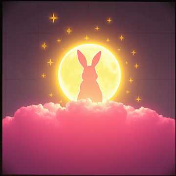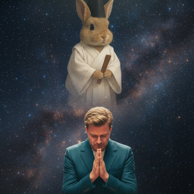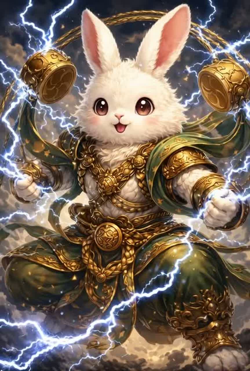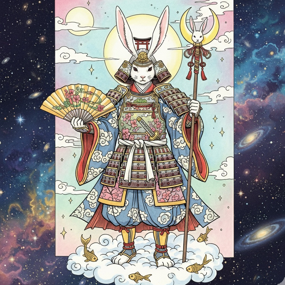 Children’s gospel choir song in waltz time, slow and majestic intro with violin leading, pipe organ and soft strings building up, bright female vocal with kids choir chanting joyfully, Japanese matsuri taiko and flutes subtly blended, chorus chanting ‘顕現!うさぎ大明神!’ in full harmony, sacred yet playful, fluffy sparkles in a graceful divine waltz, Slow