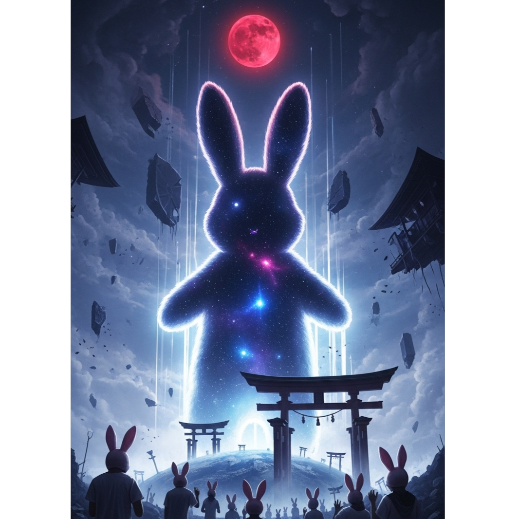 Create a fast, playful jazz-rock remix led by brass and piano, Tempo around 170 BPM, with swinging drums and syncopated bass to keep a lively bebop groove, Make the brass section (trumpet, sax, trombone) the main driver — bright stabs, short riffs, and fanfare-like hits that answer the vocals in a call-and-response style, Use a bright acoustic piano playing rapid arpeggios, jazzy chords, and fills to add sparkle and momentum, with occasional virtuosic runs during breaks, Keep guitars minimal or clean, just supporting the rhythm lightly, Add tambourine hits in key spots — during choruses, after vocal punchlines, and especially right before “顕現!うさぎ大明神!” — to lift the energy and make it feel festive, Include vibraphone or glockenspiel accents to create a twinkling, starry feeling that suggests a night parade under neon lights, During the “(oi! oi! oi! oi!)” parts, drop instruments for a beat, leave just percussion and tambourine with brass hits, then slam back into full band
