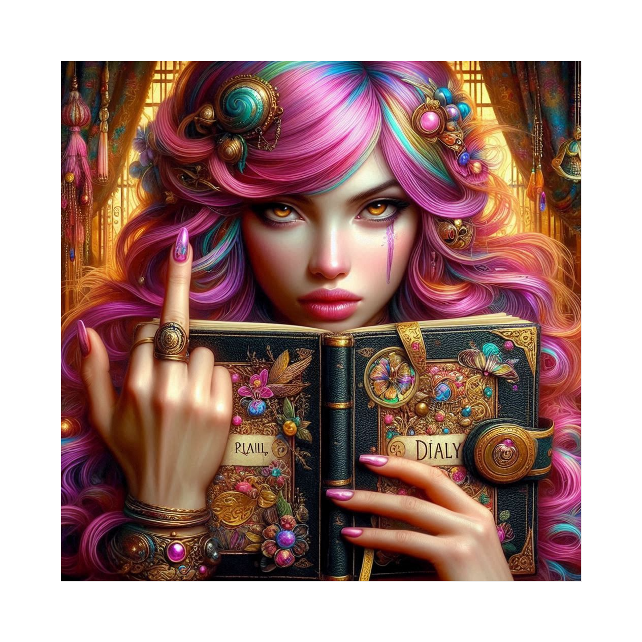 Create a female rap track with continuous flow – snappy, cheeky, sarcastic, and mentally overloaded tone, Rap style: female diss rap with clever punchlines and expressive "ugh, " sighs, eye-roll FX, Tempo switches between midtempo and doubletime, Use boom bap drums layered with experimental glitch-hop textures, Bass should be punchy: deep kick-bass, distorted sub-bass, sidechained 808s that explode like thoughts crashing, Add vinyl scratch effects (transform, chirp, flare) as transitions, Sound design includes digital noise: low-battery signals, CPU crackling, glitch stutters, input lag, system error tones, Use hall, delay, and echo to exaggerate sarcasm, Overall vibe: a snarky thought avalanche from a collapsing mental interface – dry, machine-like, sharp and provocatively smart, Soundeffekt cartoon