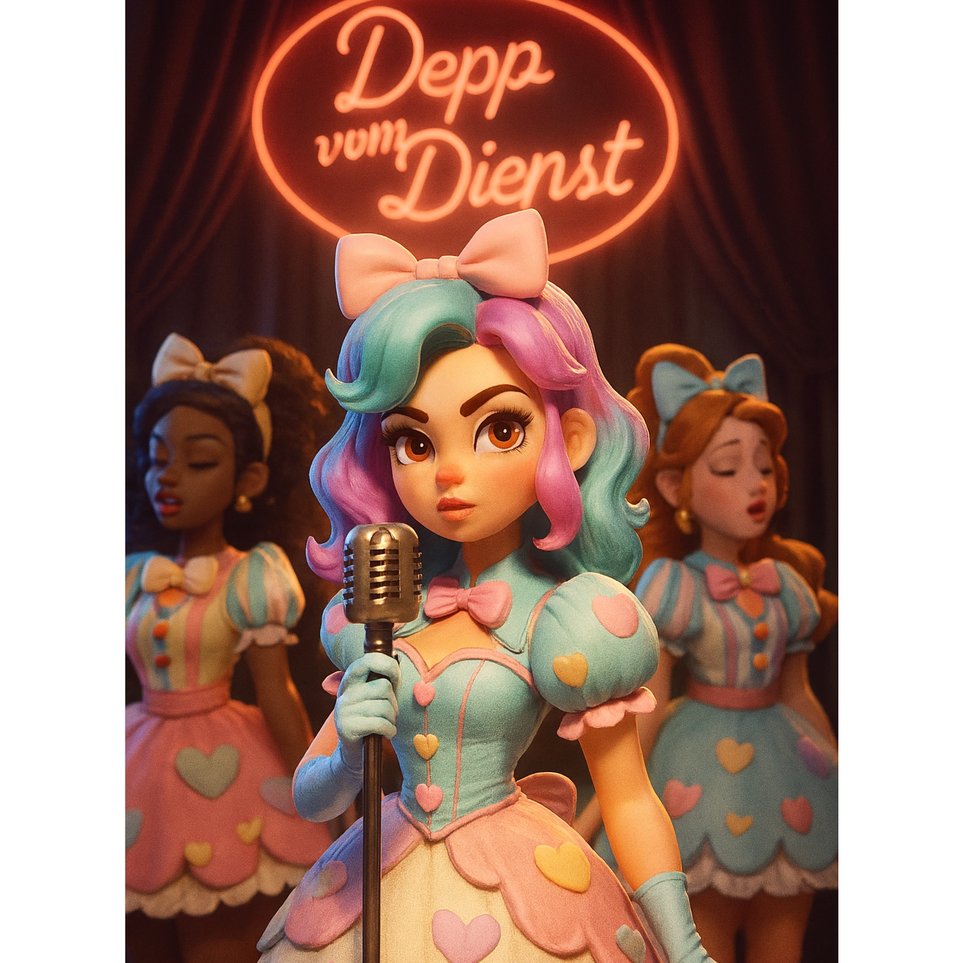 Hard female diss rap, Hard Female Rap mit Industrial Trap Vibe, Scheppernder, dreckiger moog Bass trifft auf aggressive 808s und verzerrte Kicks, Hi-Hats glitchy, unregelmäßig, schaffen Unruhe, Rap durchgehend – kein Gesang, kein Refrain, Hook ist spoken, rhythmisch betont, getragen von düsteren Kinderchor-Samples im Hintergrund – flüsternd, geisterhaft, disharmonisch, Stimme roh, präsent, ohne Effekte oder Autotune, Texte frech, provokativ, mit klarer Aussage und unterschwelliger Ironie, Tempowechsel im Flow: langsame Fragen, explosive Antwort, Doubletime-Passagen, Zwischen-den-Zeilen-Spannung: suggestiv, unbequem, emotional geladen, Beat-Atmosphäre: bedrückend, düster, cinematisch – Puppentheater, Fadenmetaphern, Matrix-Exodus, Soundtrack für Selbstermächtigung mit Stahlseele, Fuck off sing in echo background, Sub Bass 808-Bass lush Bass, female rap vocal cheeky hard autoritär