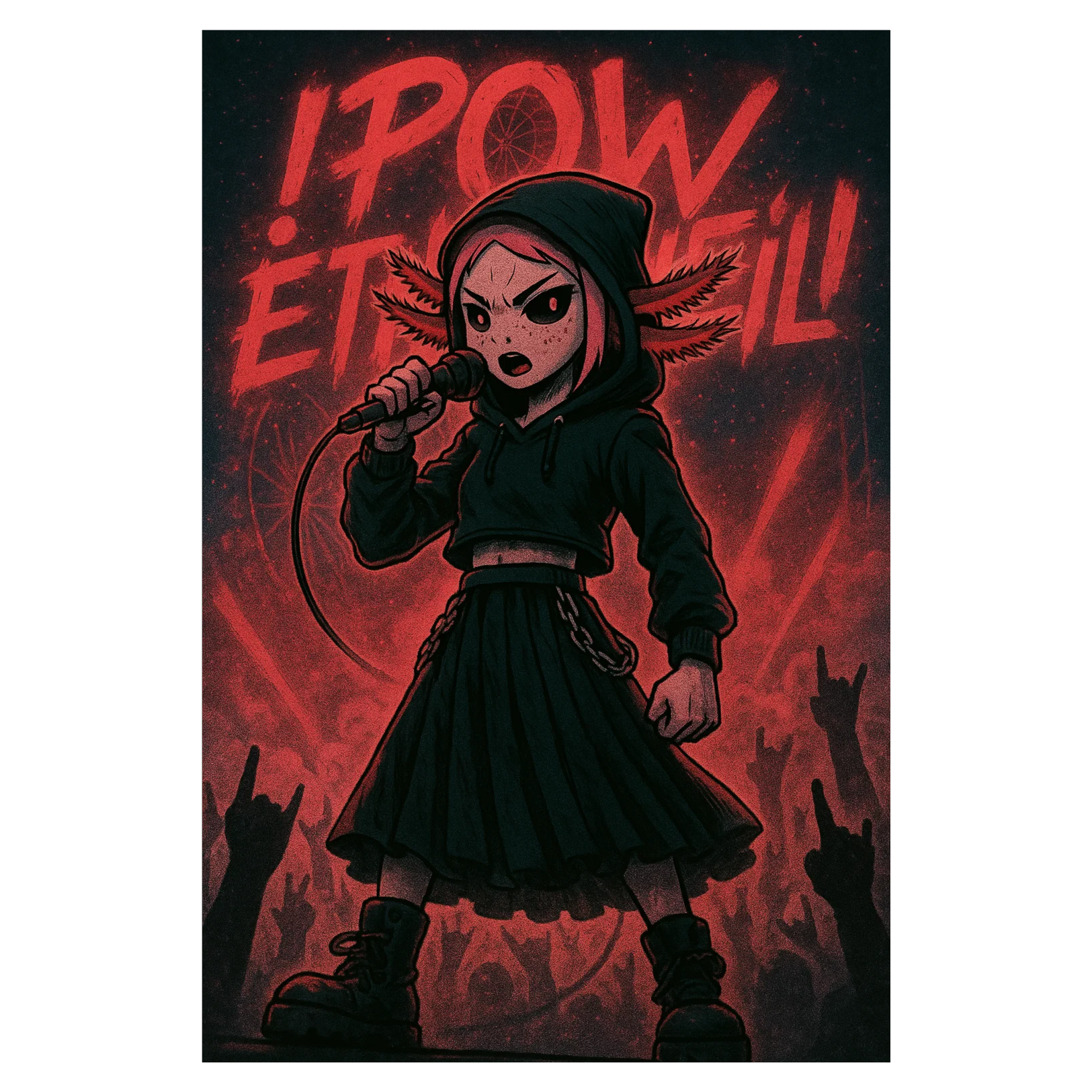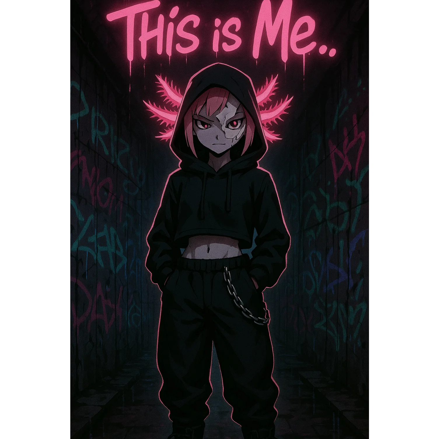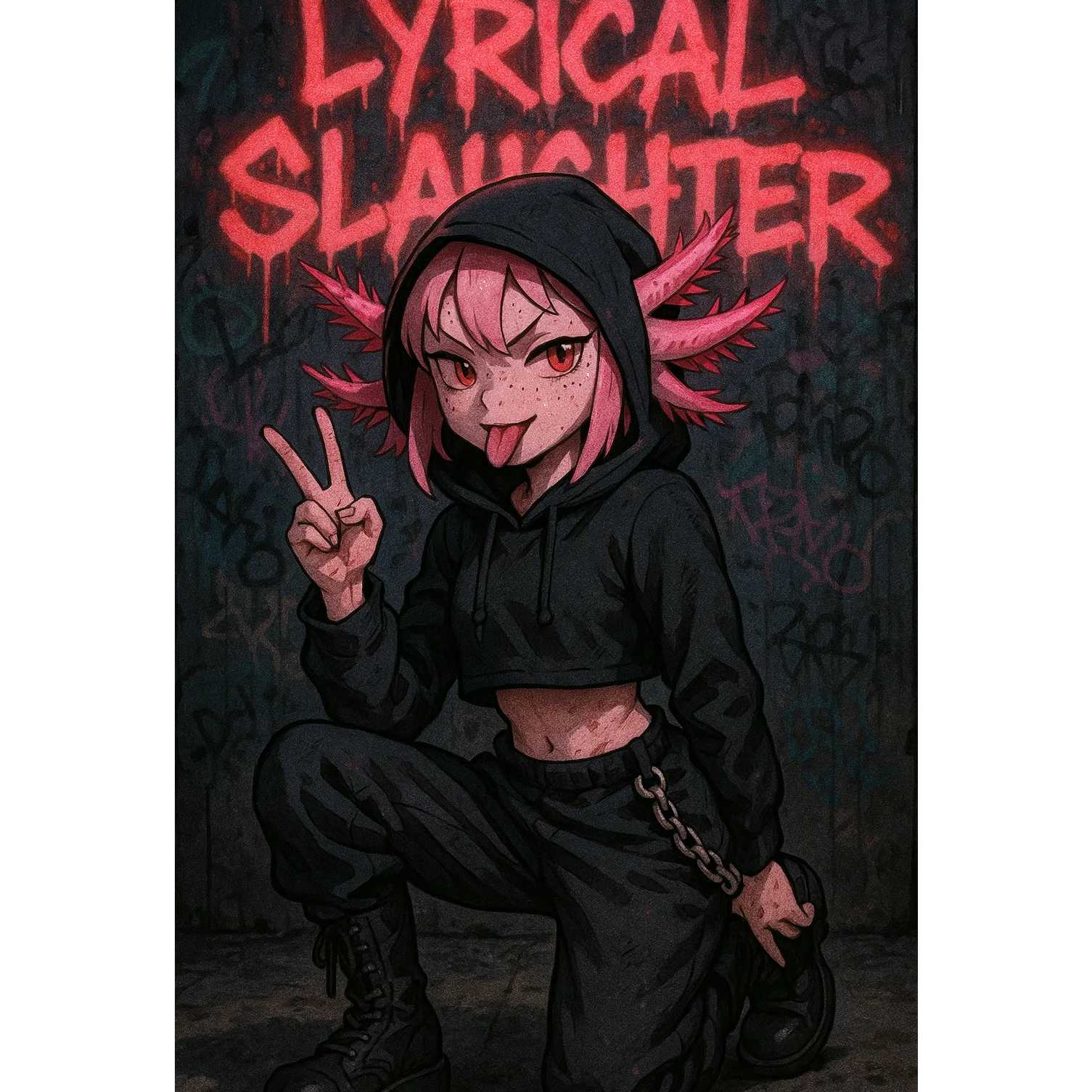 A dark Drum and Bass foundation powers the track with heavy breakbeats and throbbing sub-bass, layered with crisp, perfectly EQ’d hip-hop elements and playful dark kawaii synth textures, Twangy guitar licks punctuate the verse, supporting razor-sharp, emotional female rap flowing over a pristine, 3D-audio master mix