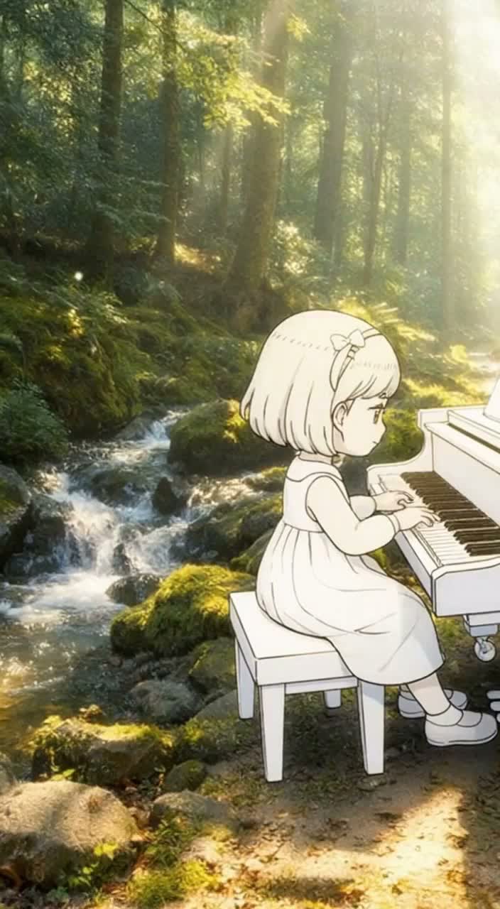 In a deep, sun-drenched forest clearing, a single elegant grand piano stands beneath cascading beams of golden light, A young girl begins to play — her touch delicate yet impossibly mature, performing a sweeping Romantic melody far beyond her years, Chopin-inspired expressive piano solo as the centerpiece, Lyrical rubato, emotional phrasing, flowing arpeggios, tender yet powerful dynamics, Subtle string accompaniment enters gradually — soft violins and cellos supporting the piano without overpowering it, The melody feels nostalgic, intimate, and deeply human — like a forgotten nocturne echoing through nature, Leaves tremble gently, birds fall silent, squirrels pause mid-step, as if the forest itself is breathing with the music, Romantic classical atmosphere, warm natural reverb, organic acoustic sound, poetic melancholy, elegant crescendos, refined emotional climax, No modern synths, Pure classical texture